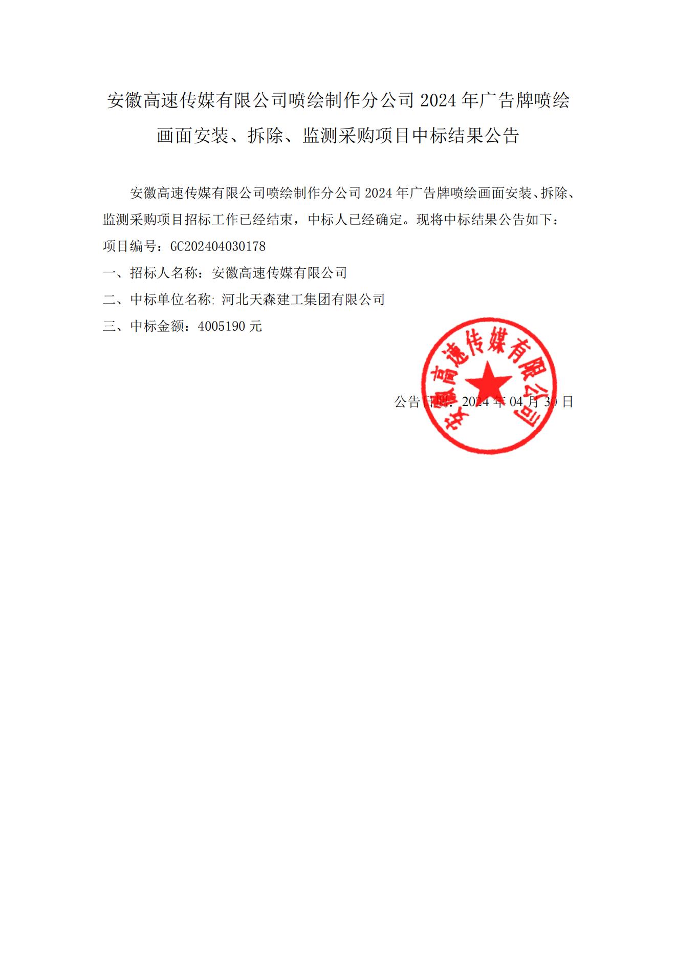 安徽高速传媒有限公司喷绘制作分公司2024年广告牌喷绘画面安装、拆除、监测采购项目中标结果公告