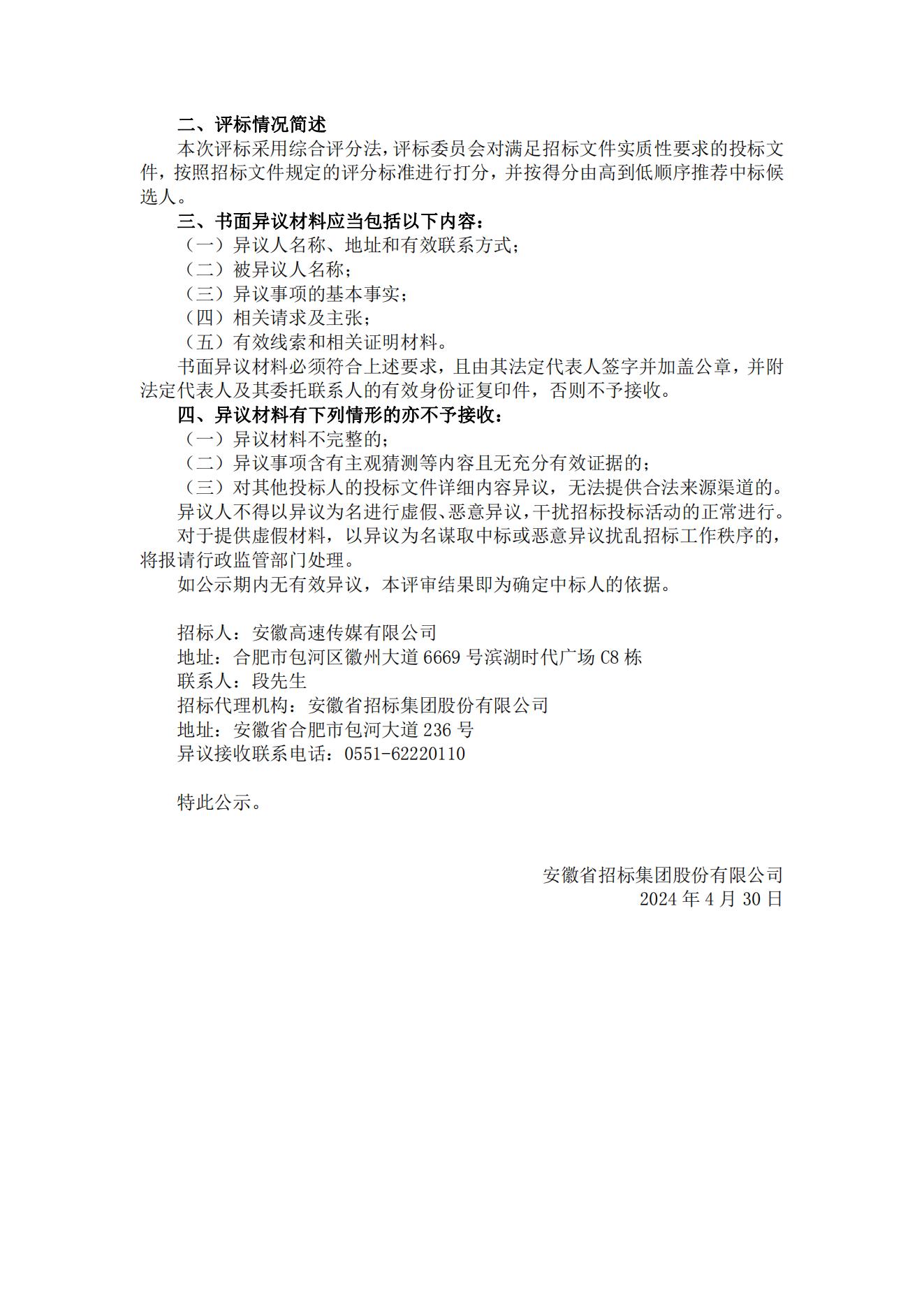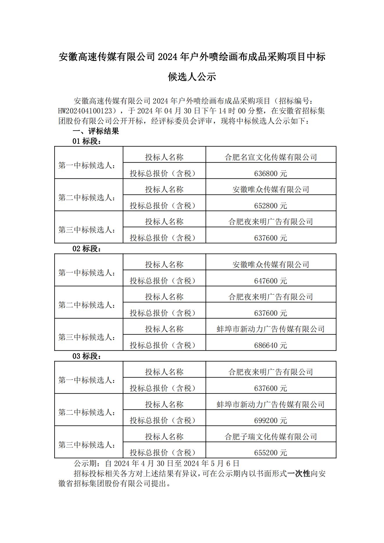 安徽高速传媒有限公司2024年户外喷绘画布成品采购项目中标候选人公示