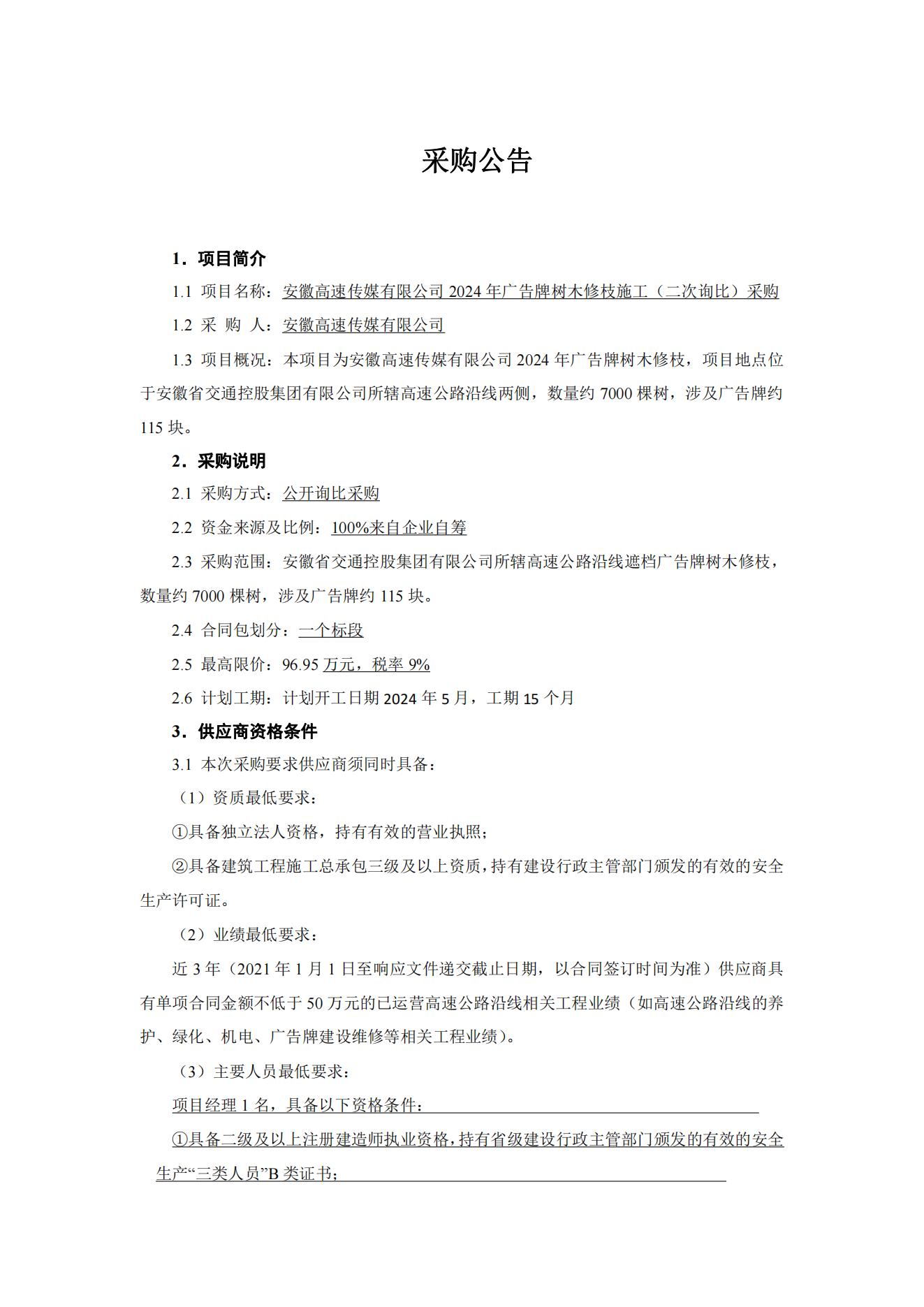 安徽高速传媒有限公司2024年广告牌树木修枝施工(二次询比)采购公告)