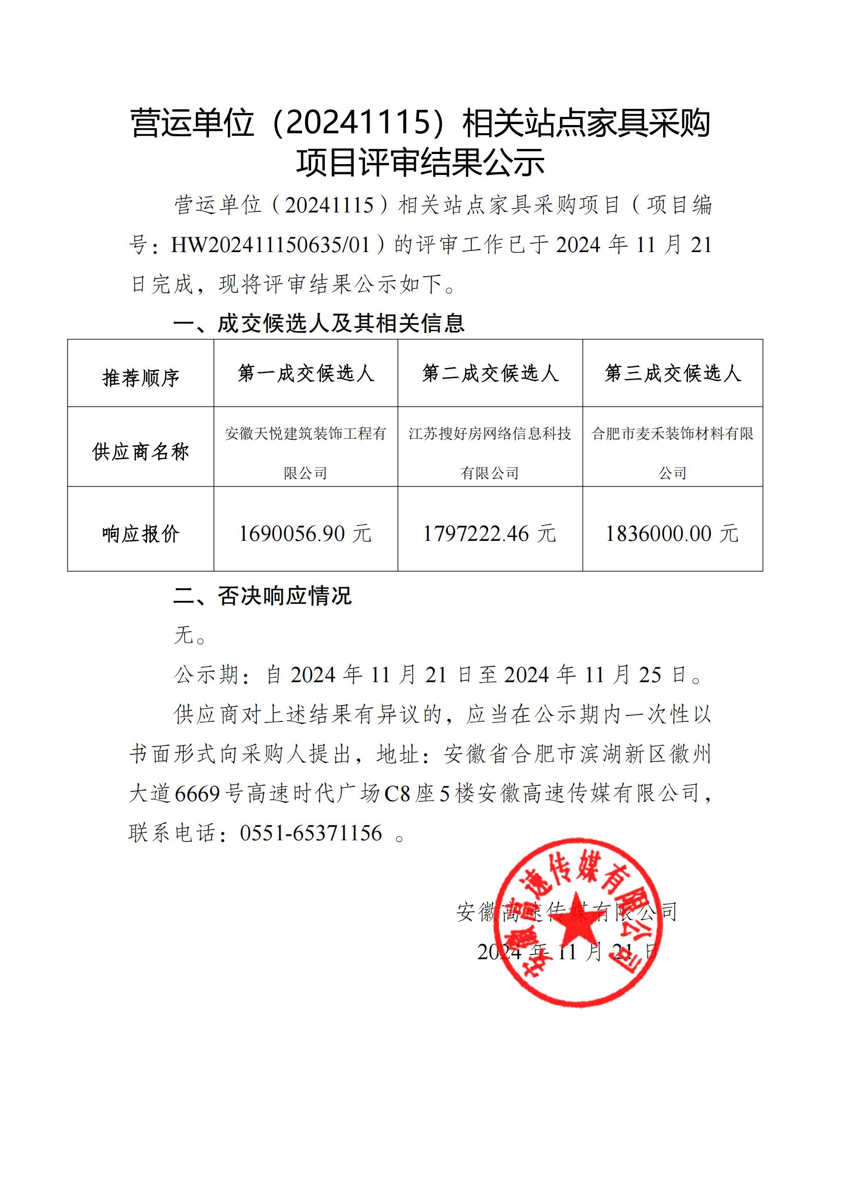 营运单位(20241115)相关站点家具采购项目评审结果公示