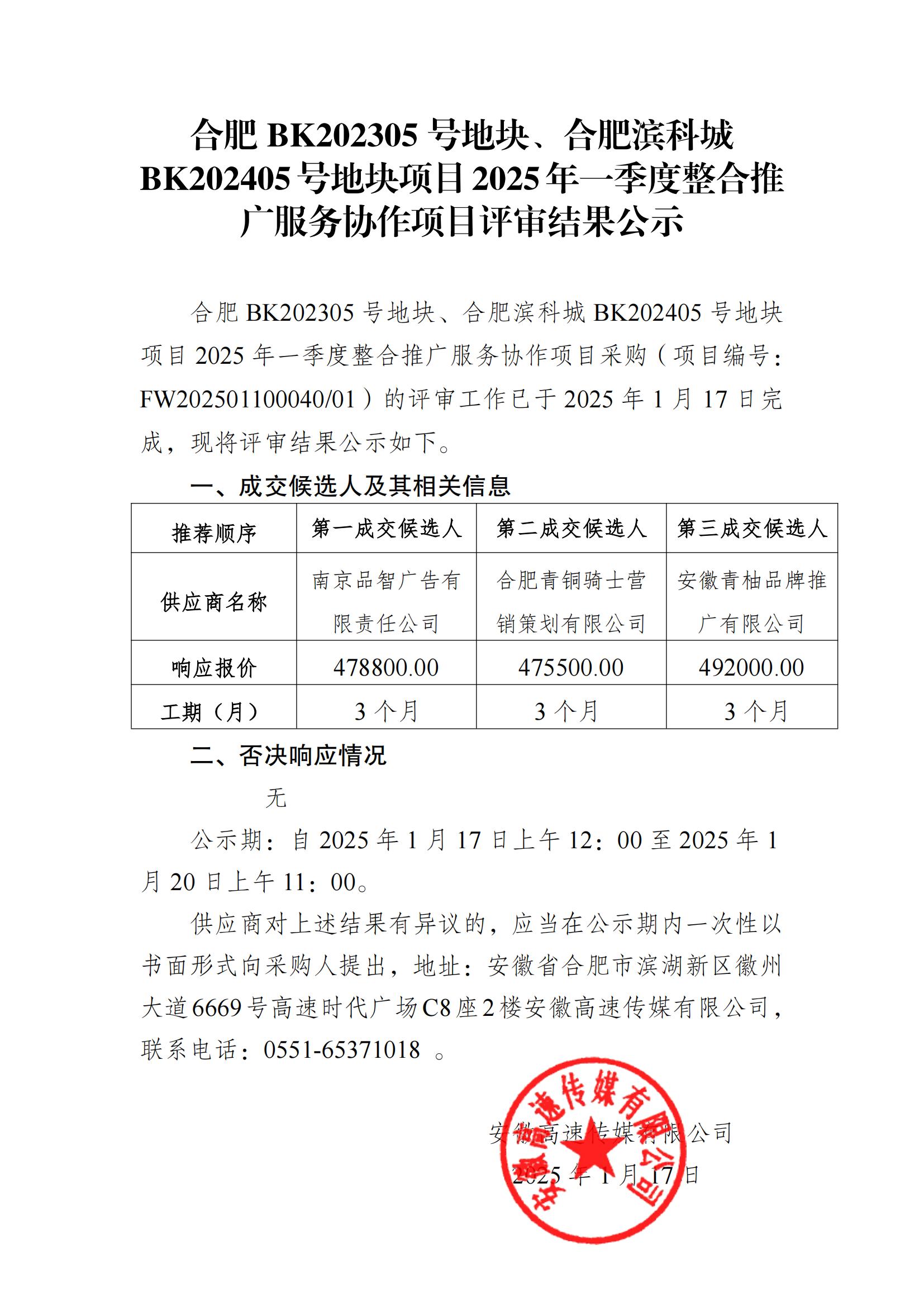 合肥BK202305号地块、合肥滨科城BK202405号地块项目2025年一季度整合推广服务协作项目评审结果公示