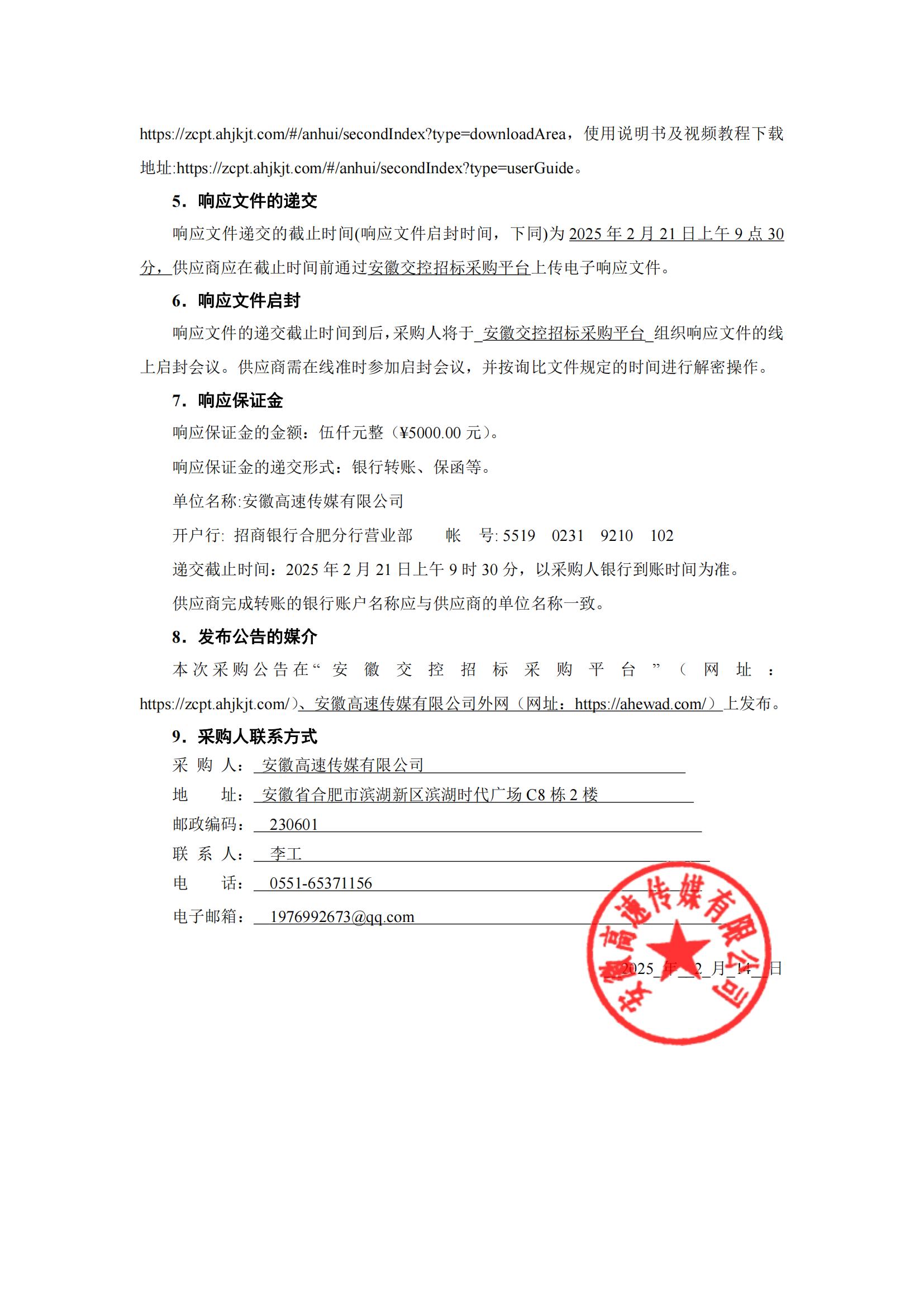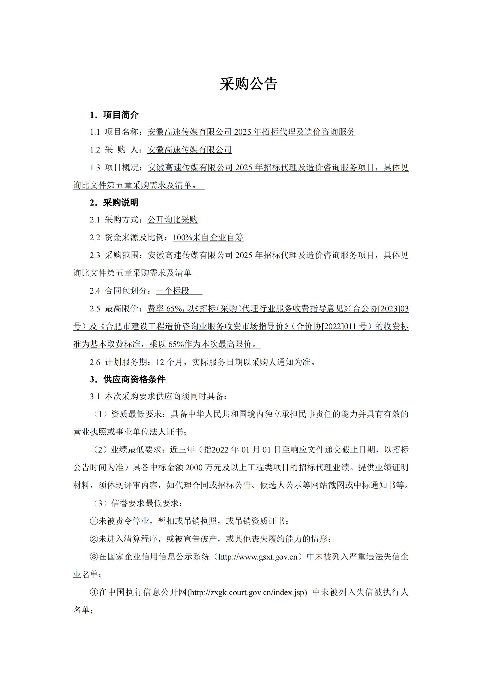 安徽高速传媒有限公司2025年招标代理及造价咨询服务