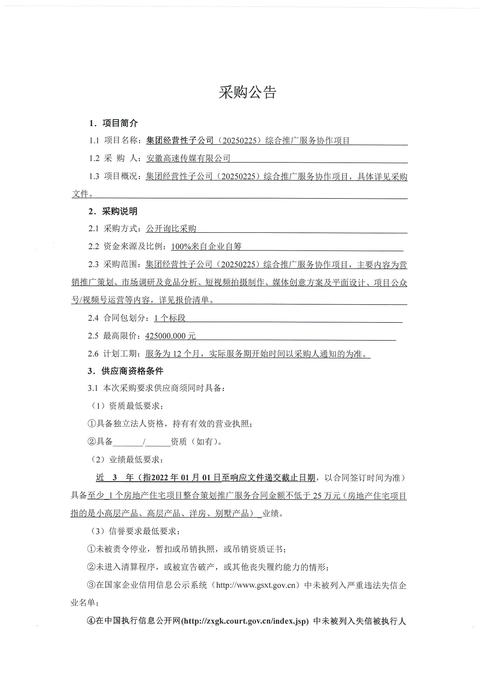 集团经营性子公司(20250225)综合推广 服务协作项目采购公告
