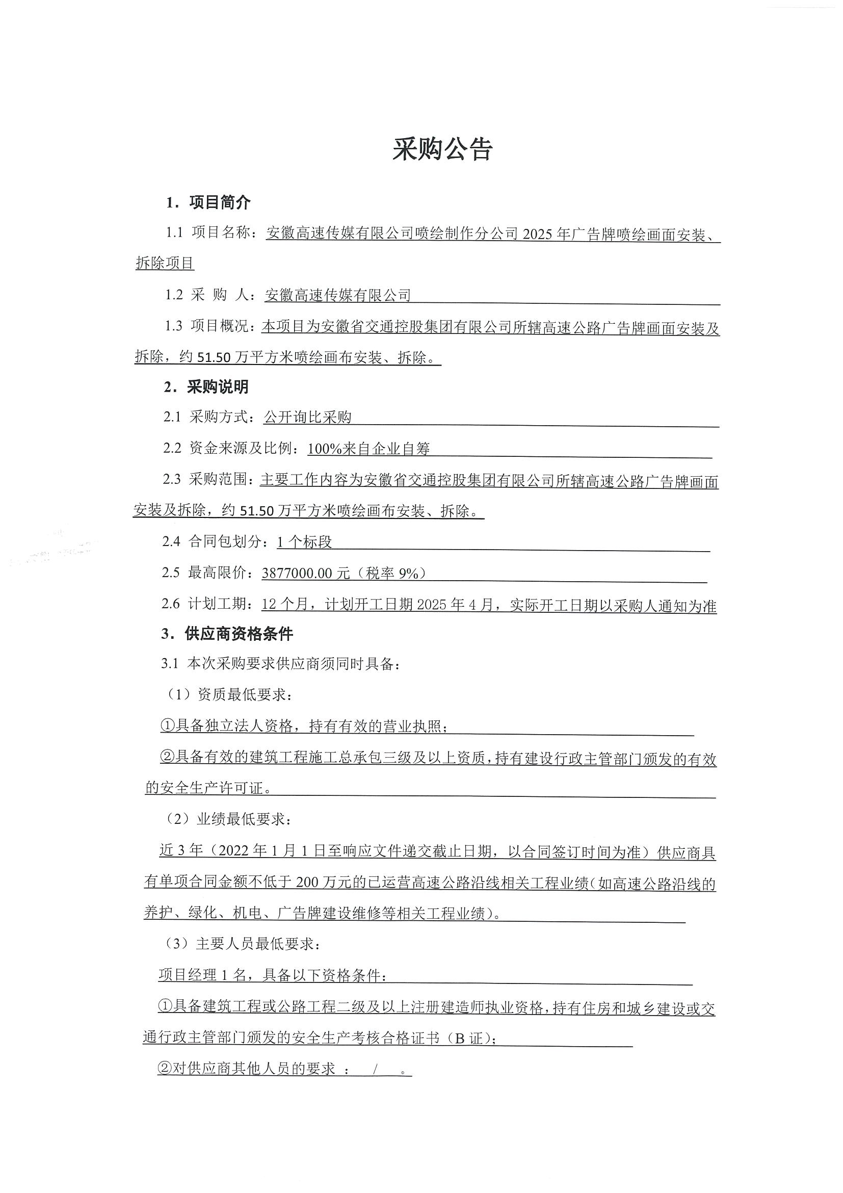 安徽高速传媒有限公司喷绘制作分公司2025年广告牌喷绘画面安装、拆除项目采购公告
