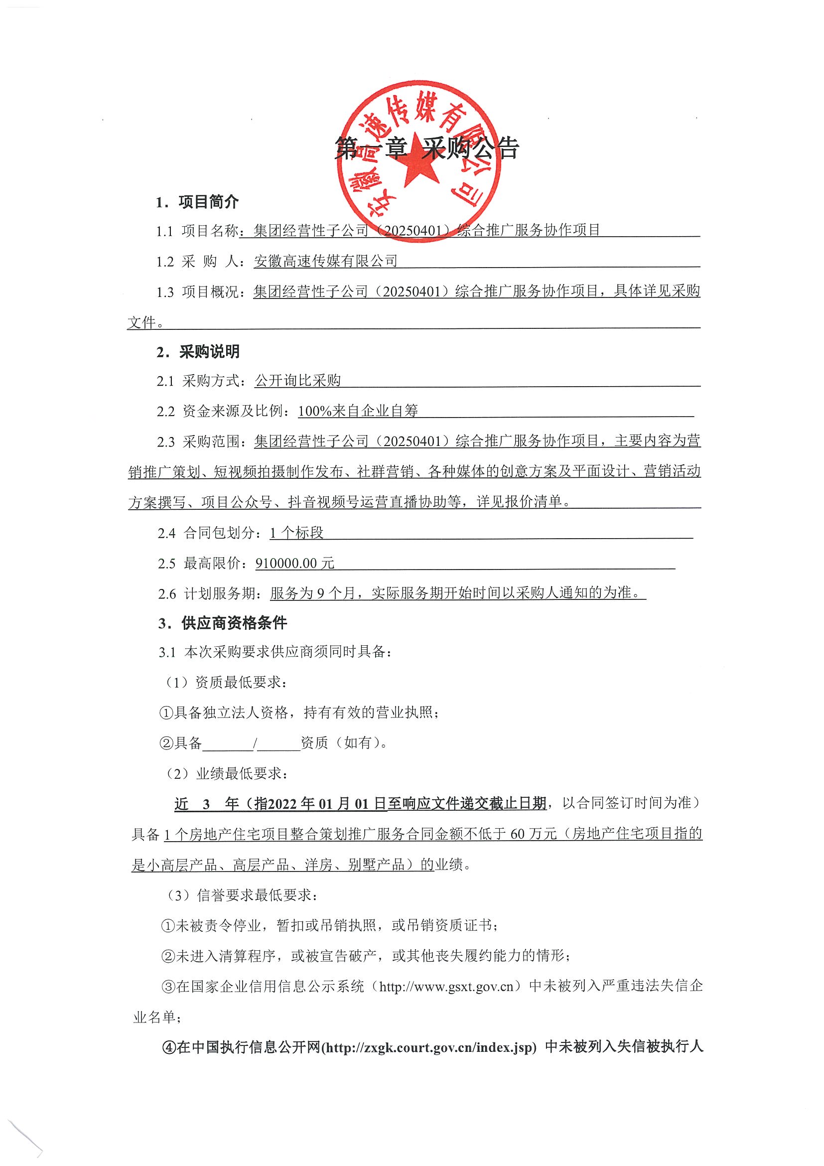 集团经营性子公司(20250401)综合推广服务协作项目采购公告