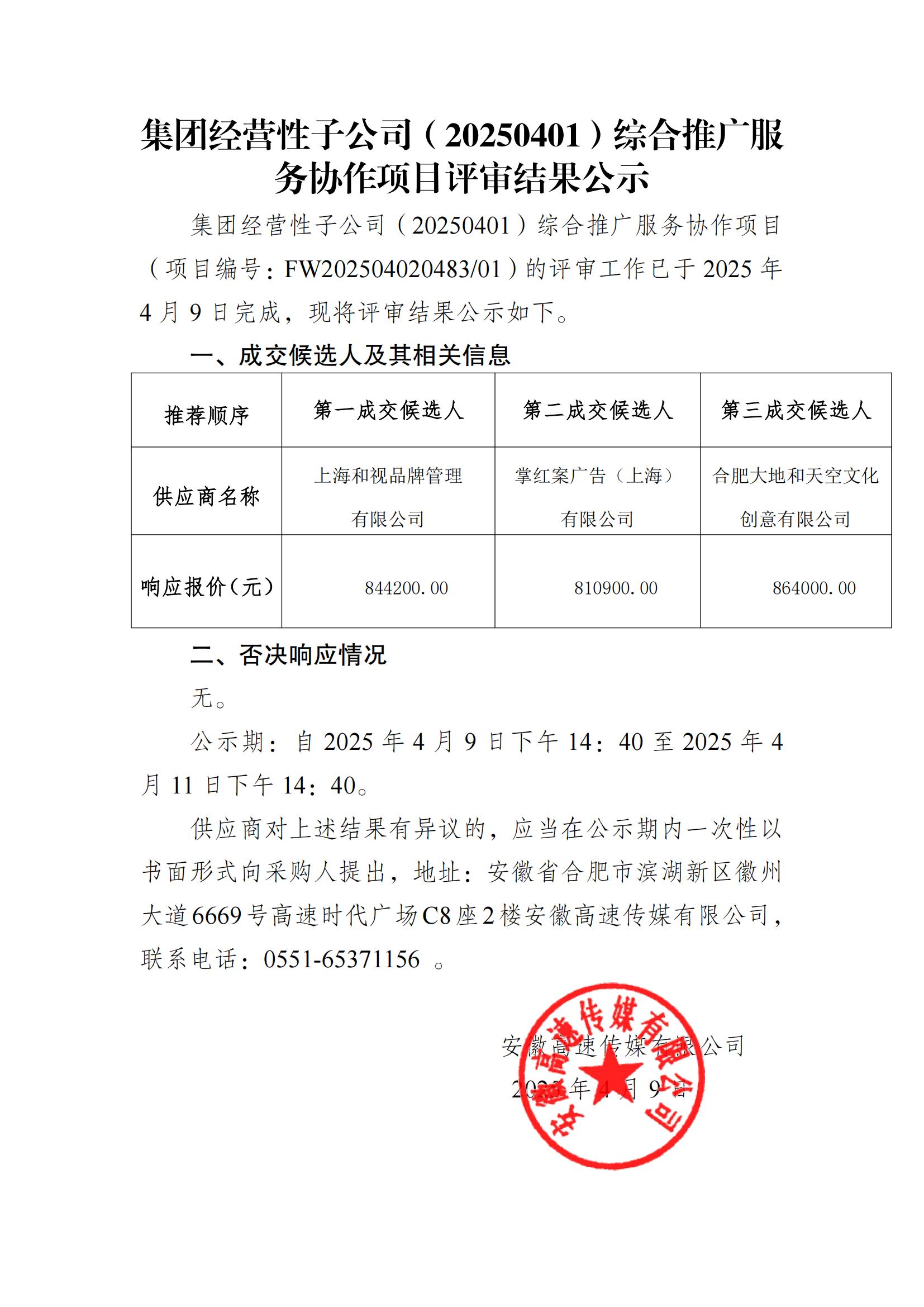 集团经营性子公司(20250401)综合推广服务协作项目评审结果公示