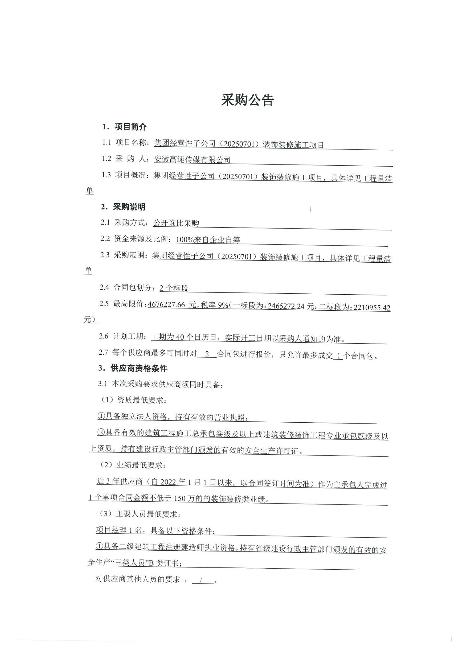 集团经营性子公司(20250701)装饰装修施工项目采购公告