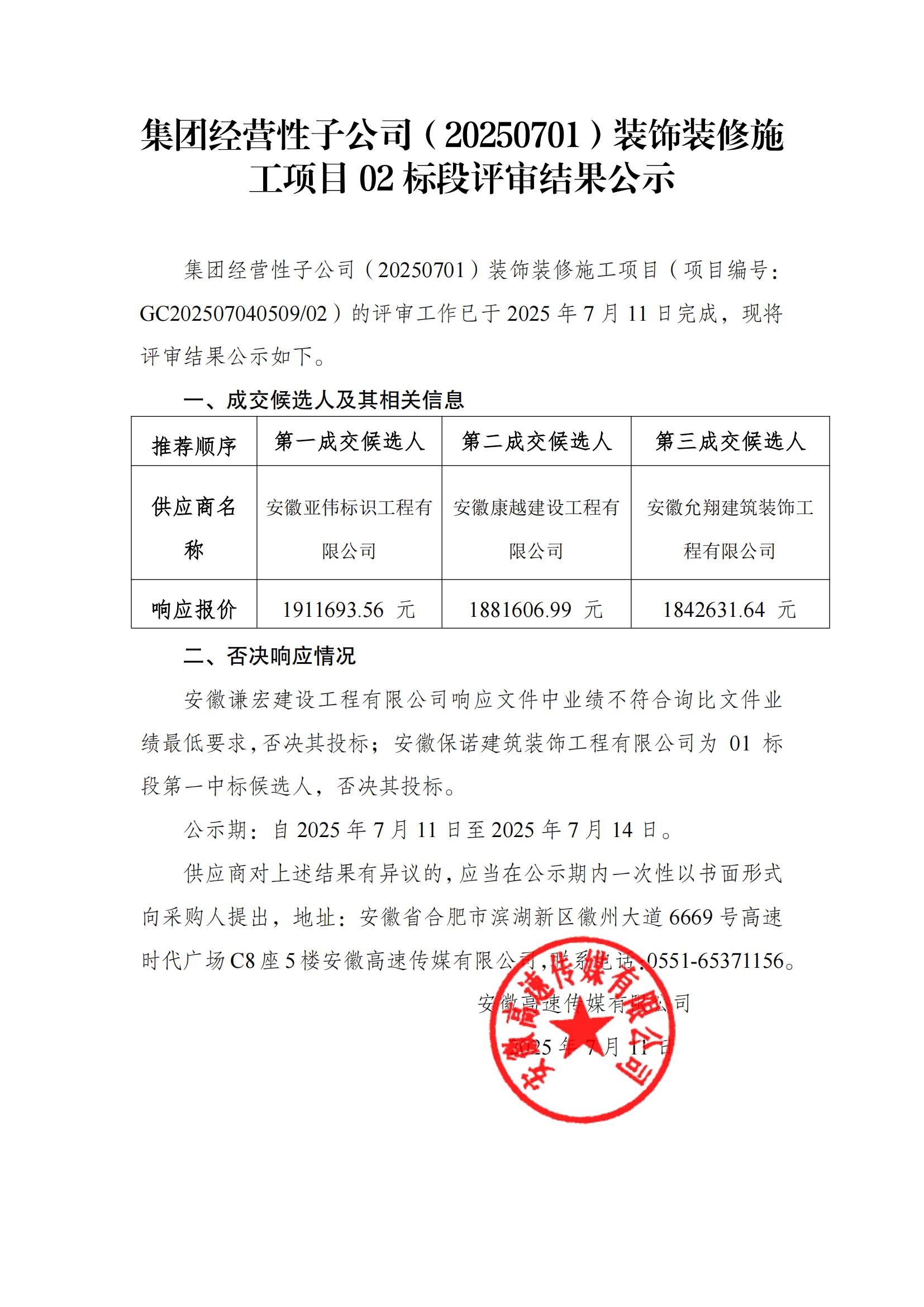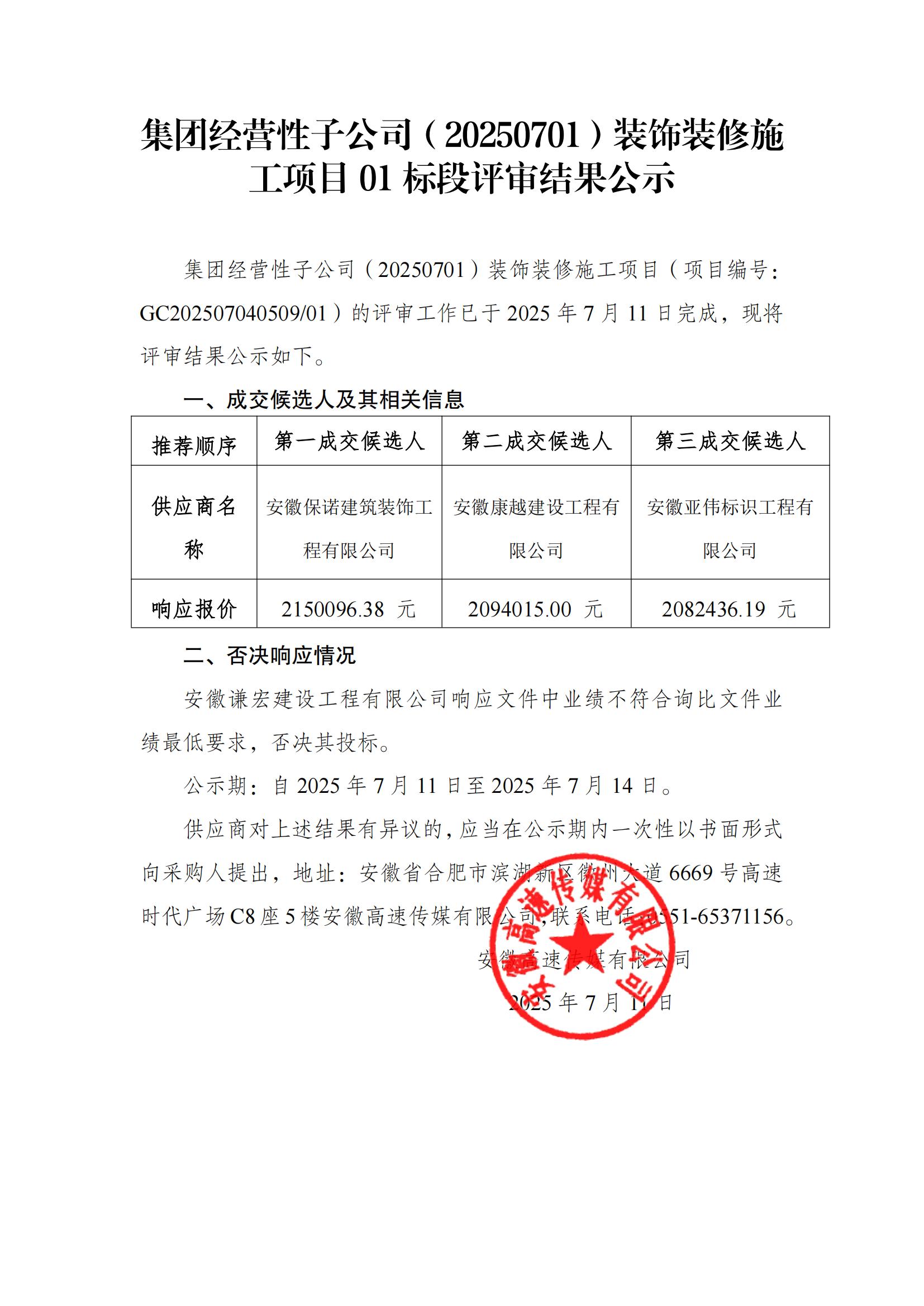 集团经营性子公司(20250701)装饰装修施工项目评审结果公示