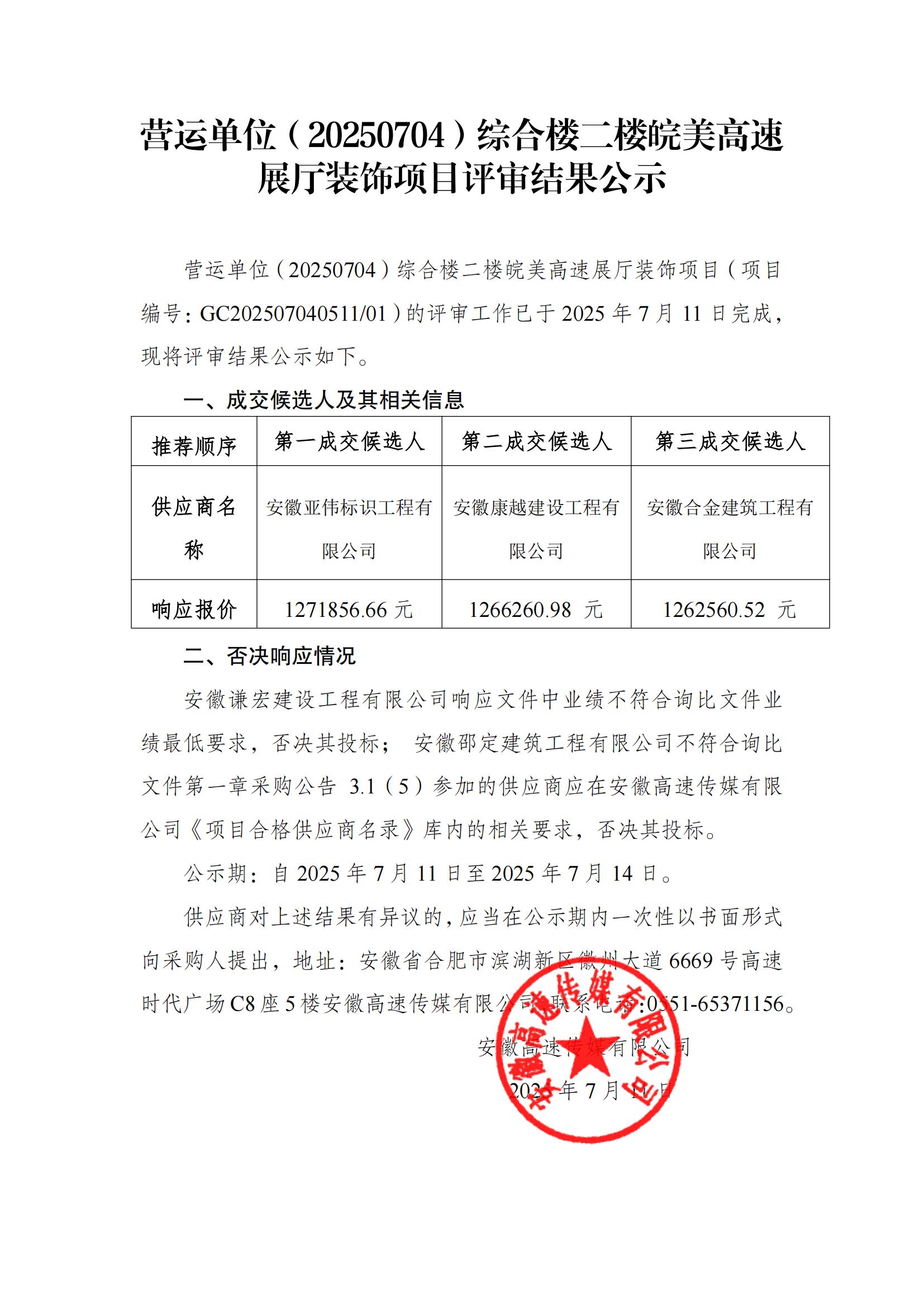 营运单位(20250704)综合楼二楼皖美高速展厅装饰项目评审结果公示