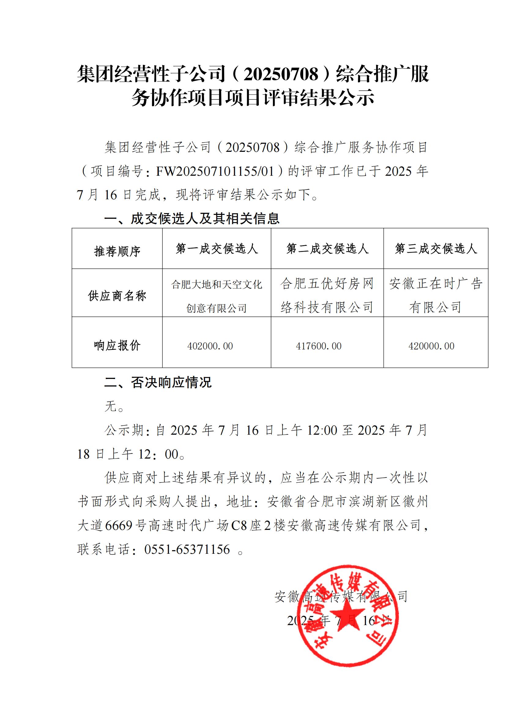 集团经营性子公司(20250708)综合推广服务协作项目项目评审结果公示