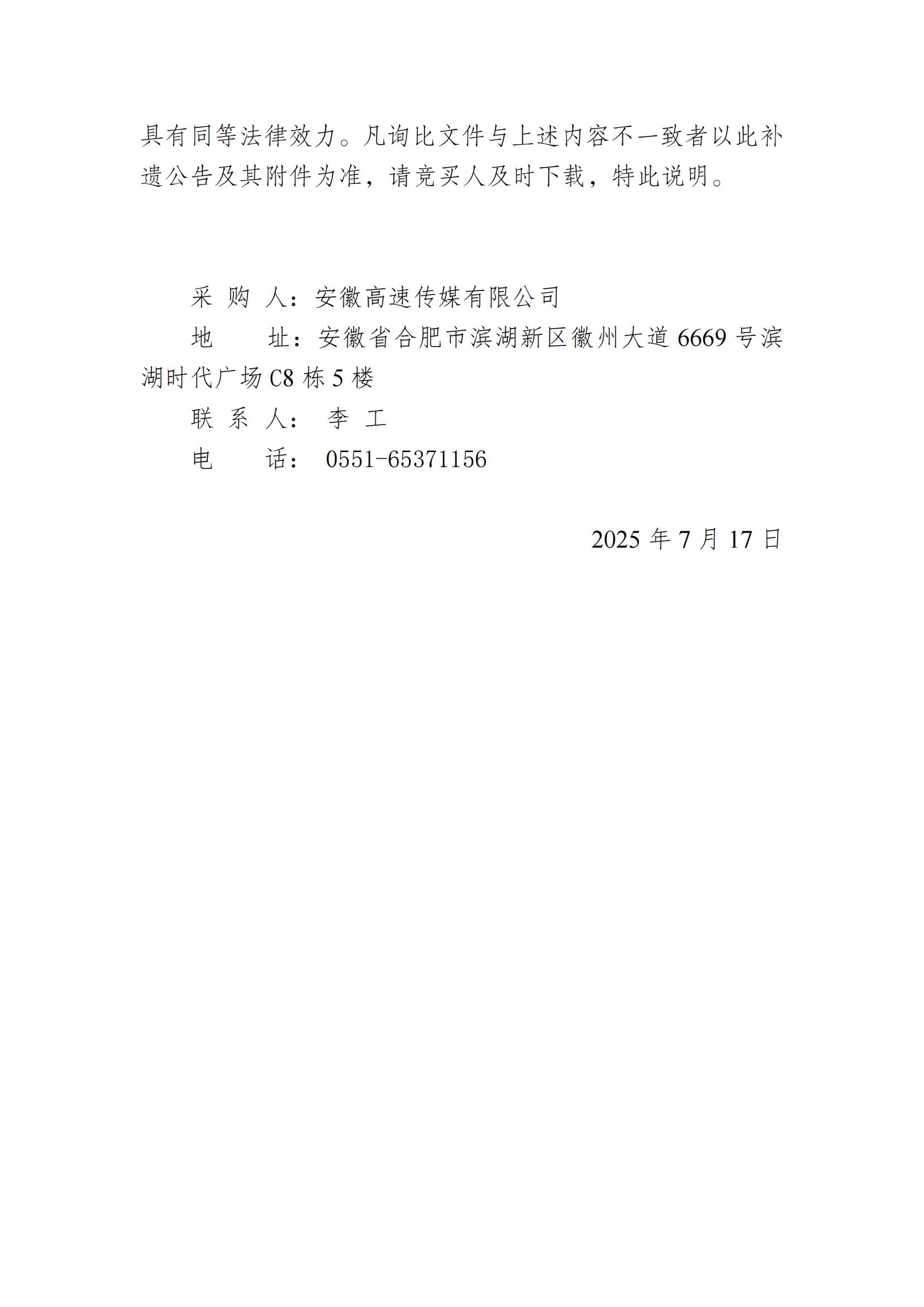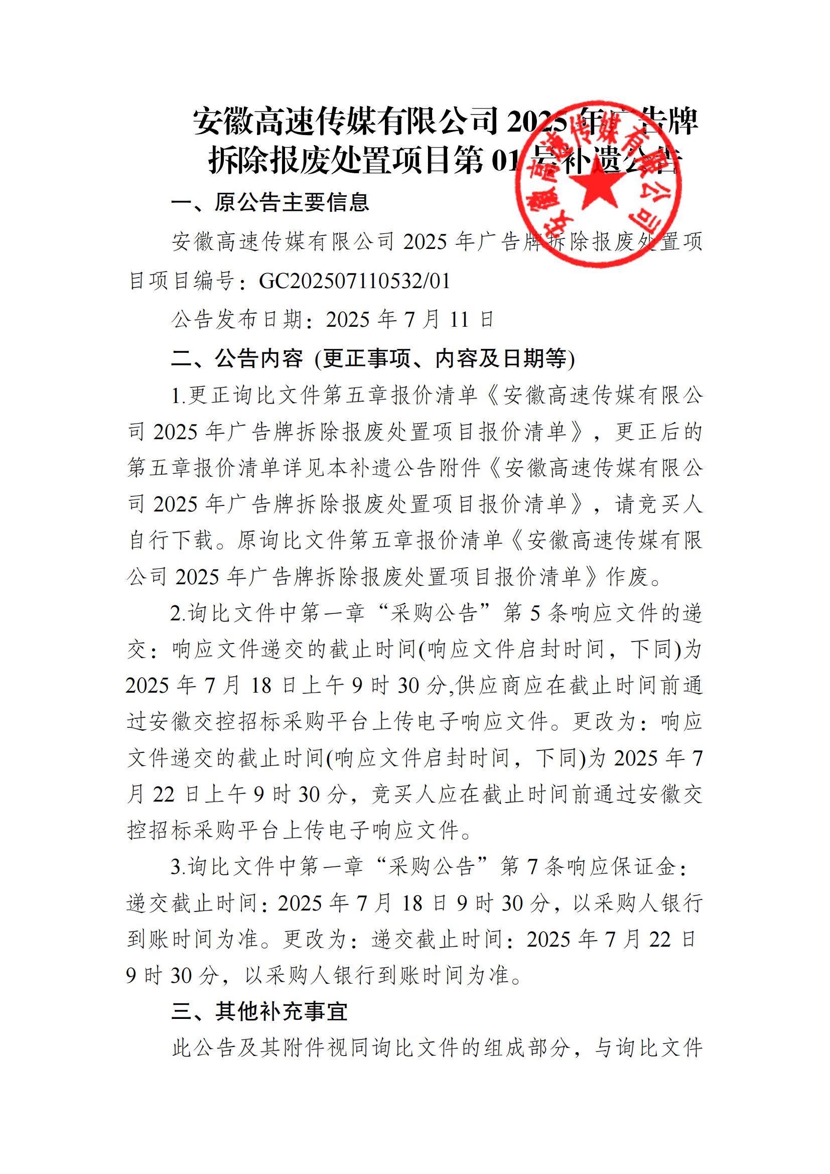 安徽高速传媒有限公司2025年广告牌 拆除报废处置项目第01号补遗公告