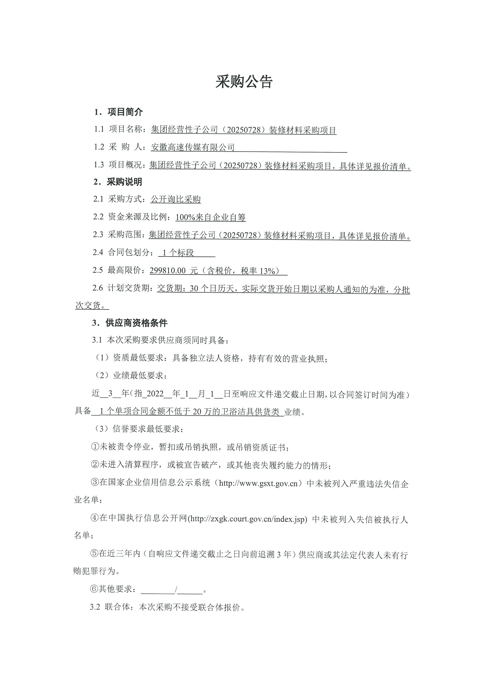 集团经营性子公司(20250728)装修材料采购项目采购公告
