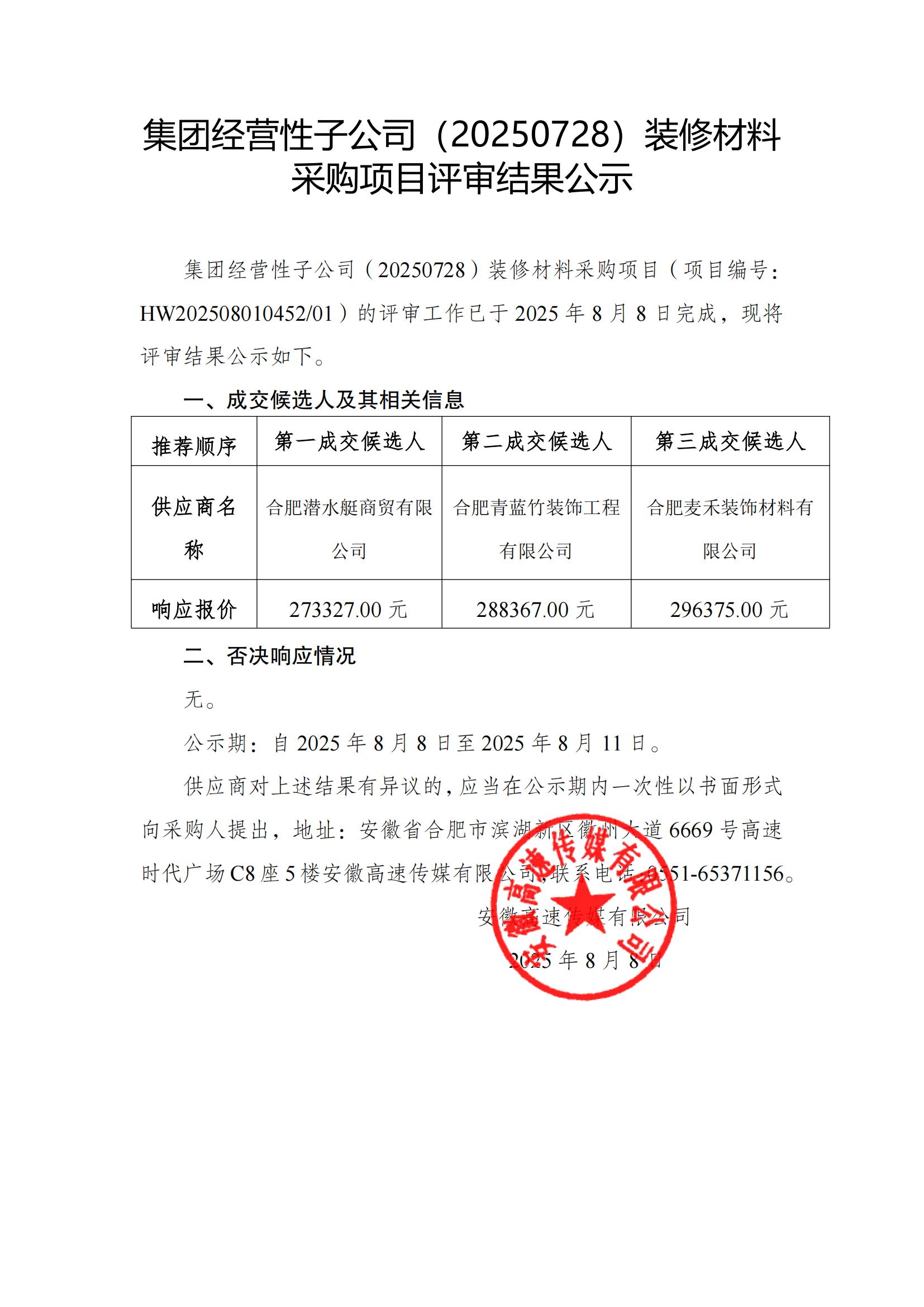 集团经营性子公司(20250728)装修材料采购项目评审结果公示