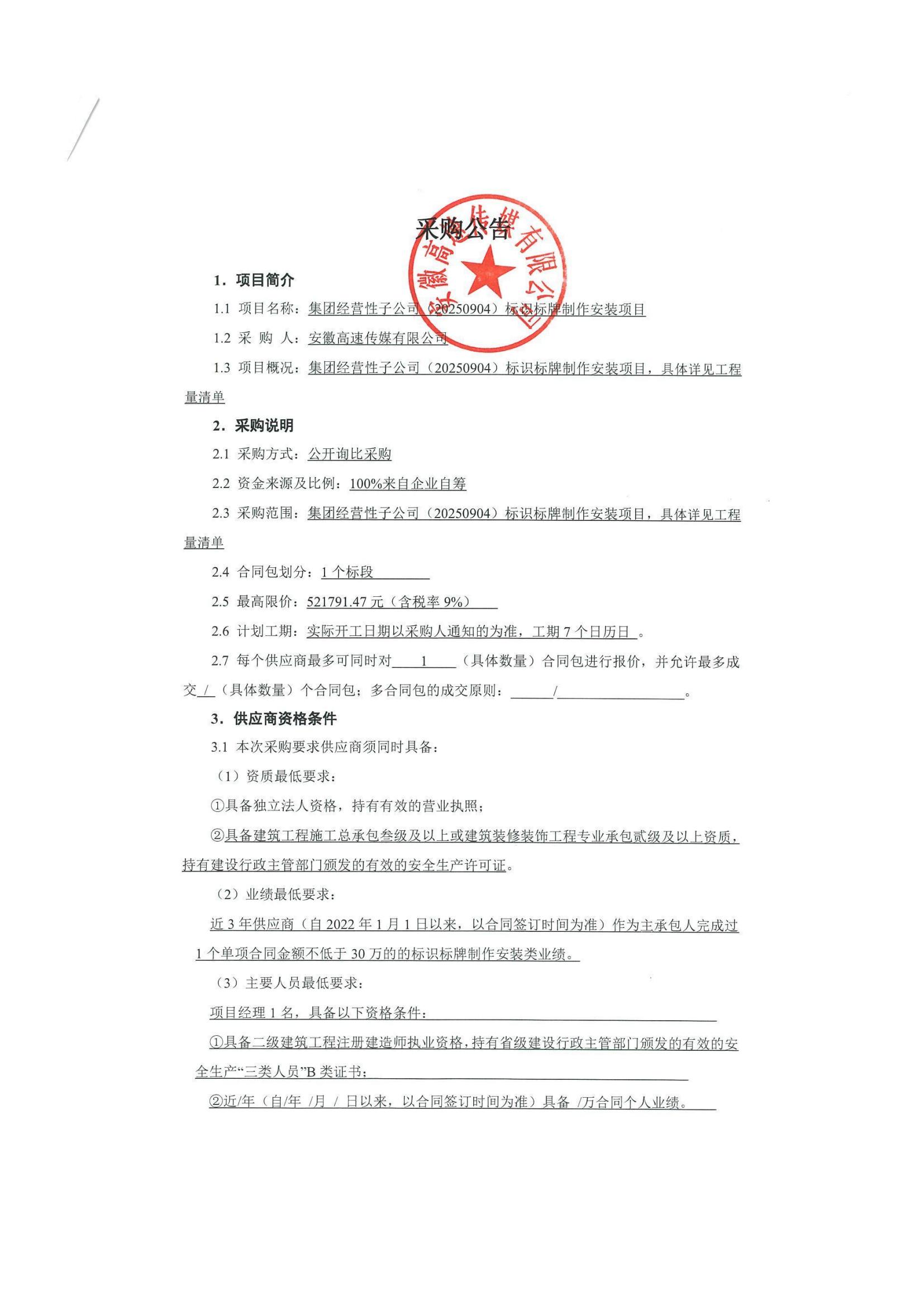 集团经营性子公司(20250904)标识标牌制作安装项目采购公告