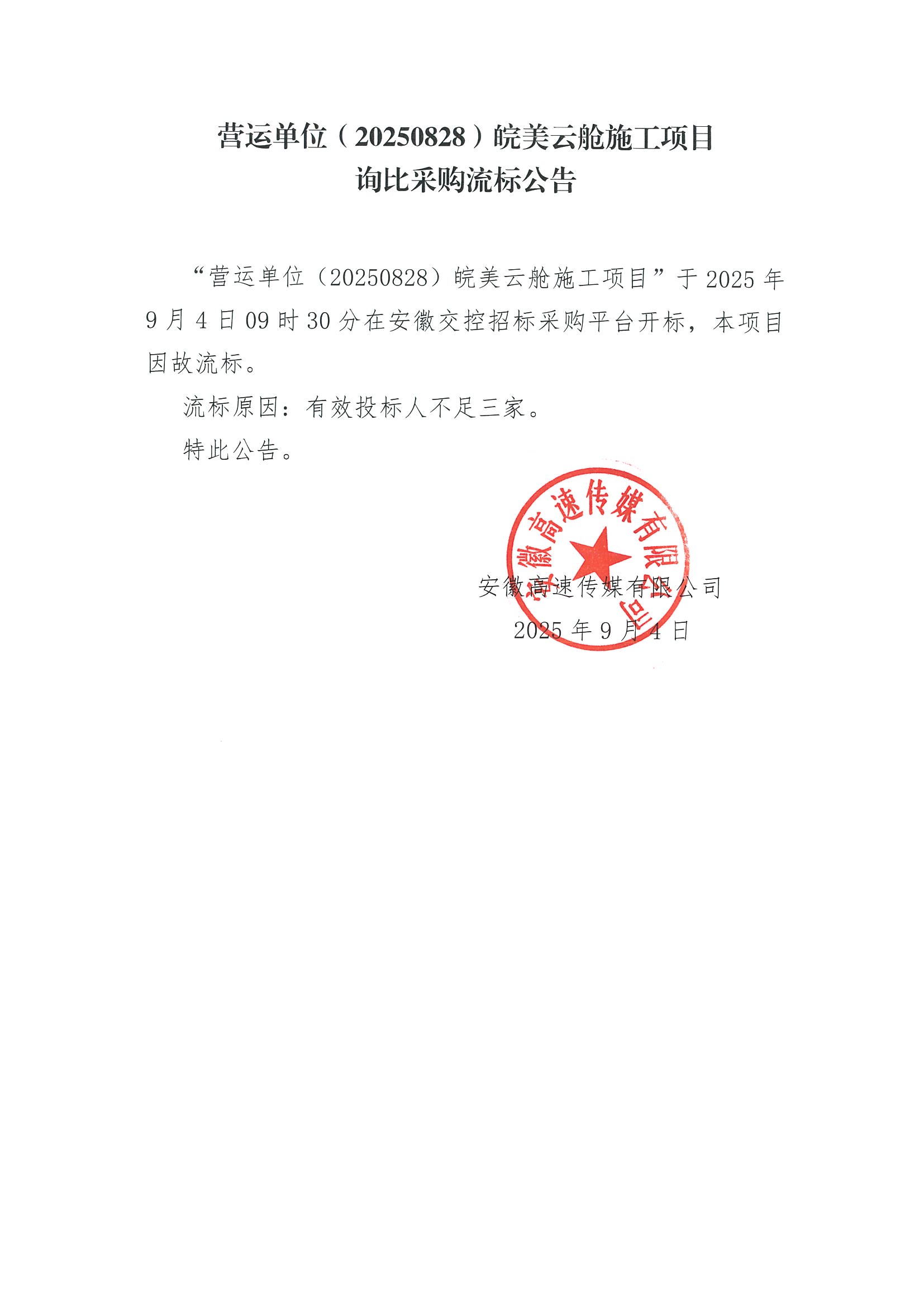 营运单位(20250828)皖美云舱施工项目采购流标公告