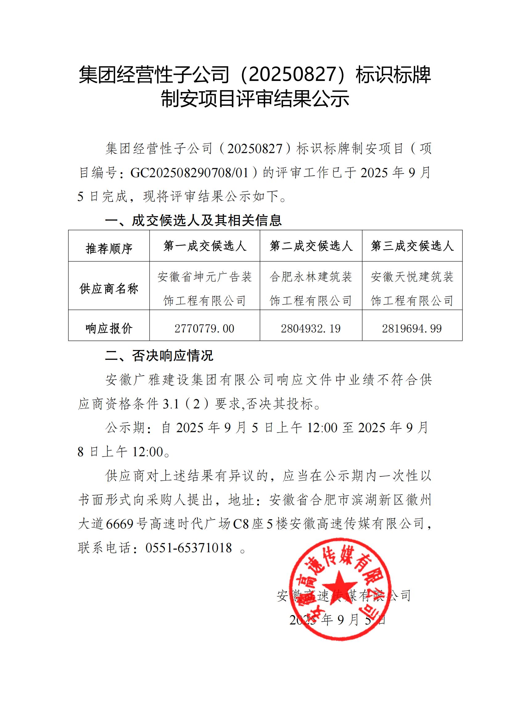 集团经营性子公司(20250827)标识标牌制安项目评审结果公示