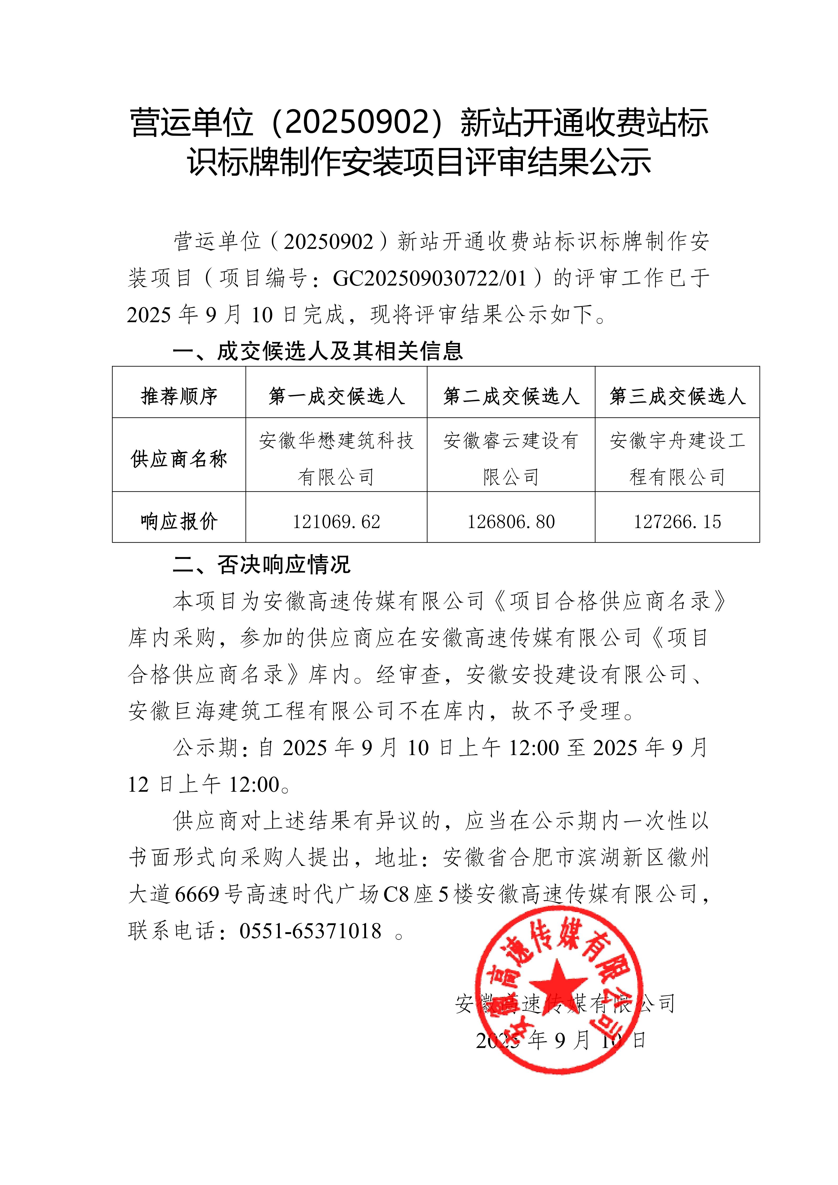 营运单位(20250902)新站开通收费站标 识标牌制作安装项目评审结果公示