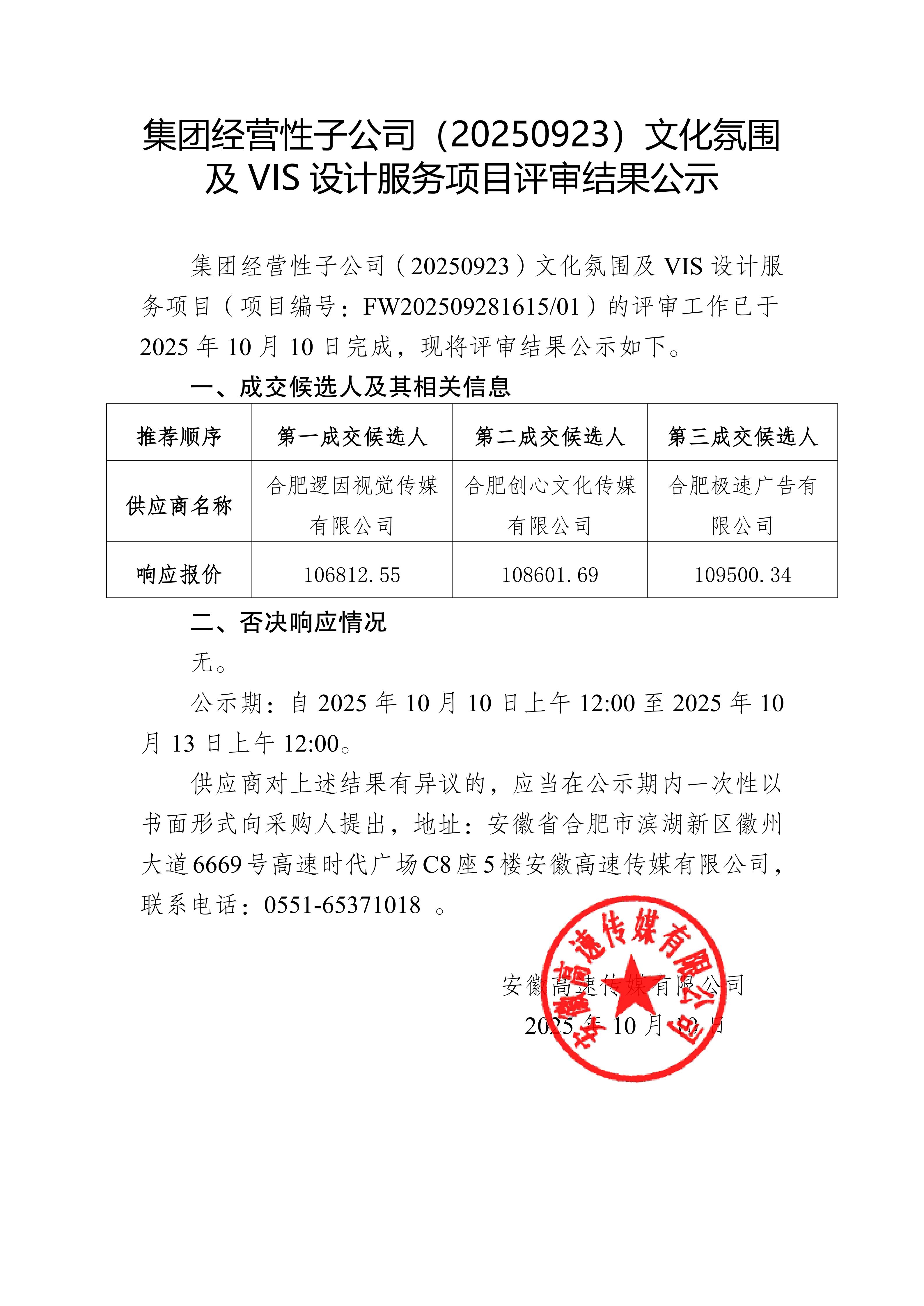 集团经营性子公司(20250923)文化氛围及 VIS 设计服务项目评审结果公示
