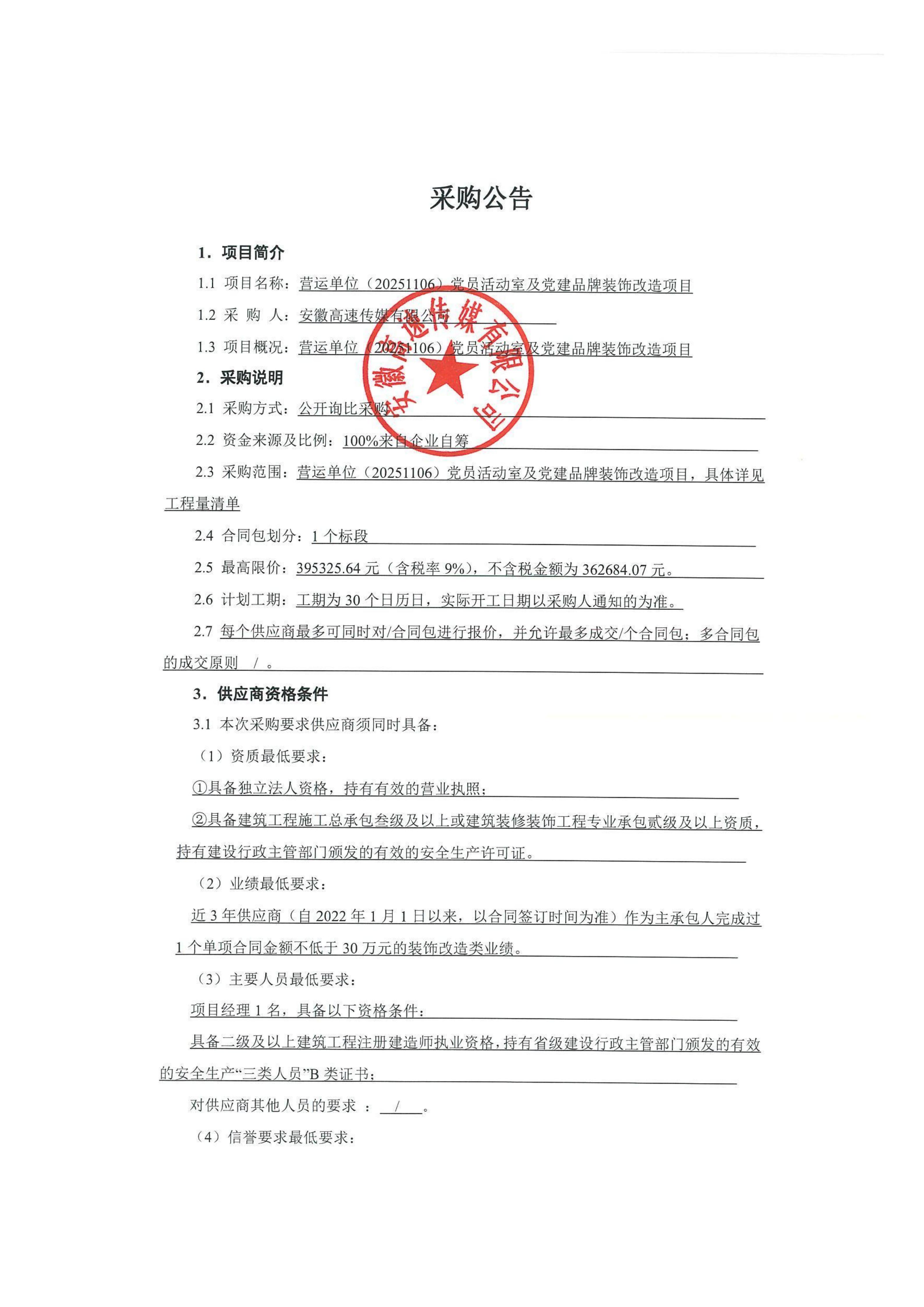 营运单位(20251106)党员活动室及党建品牌装饰改造项目采购公告
