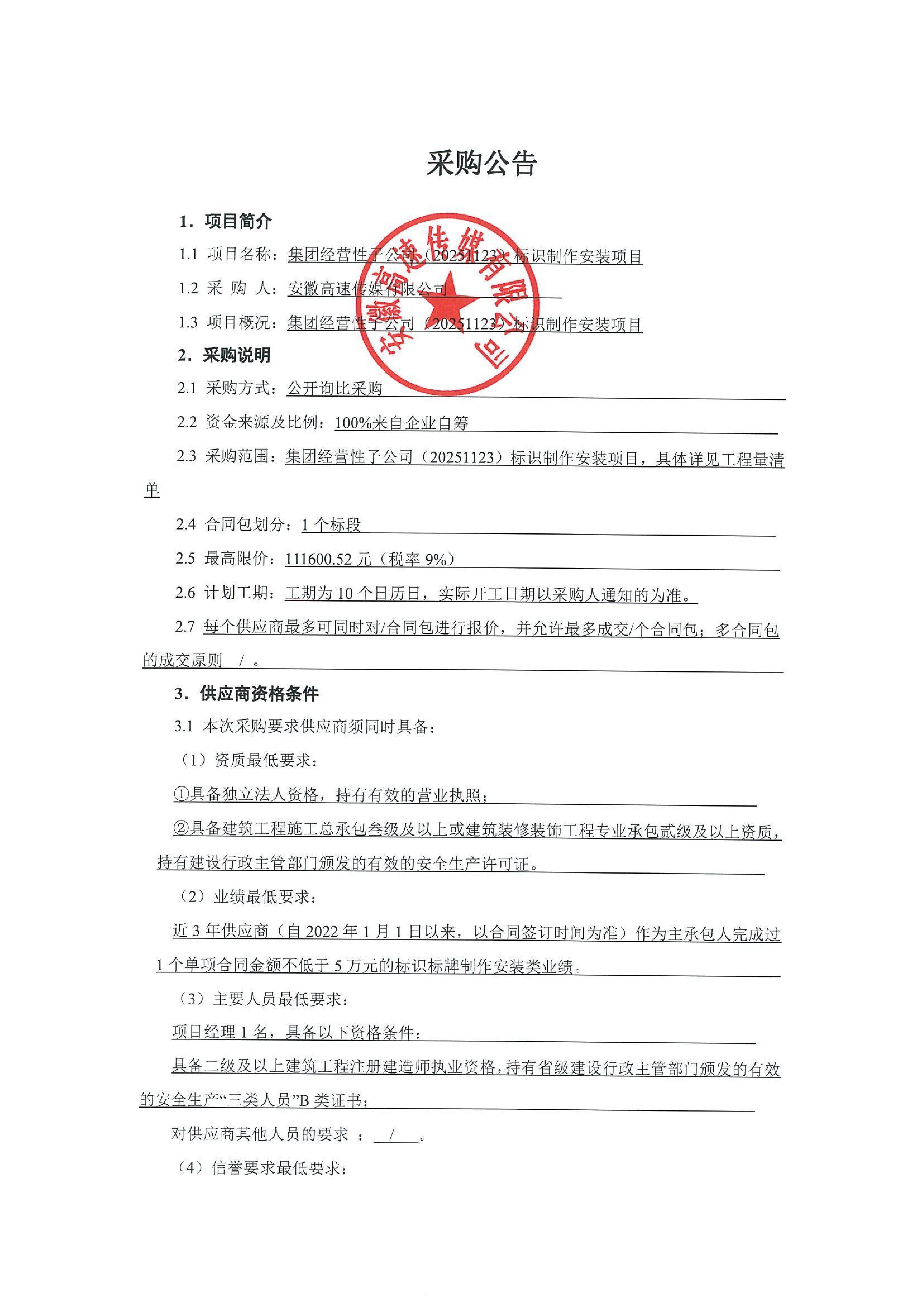 集团经营性子公司(20251123)标识制作安装项目采购公告