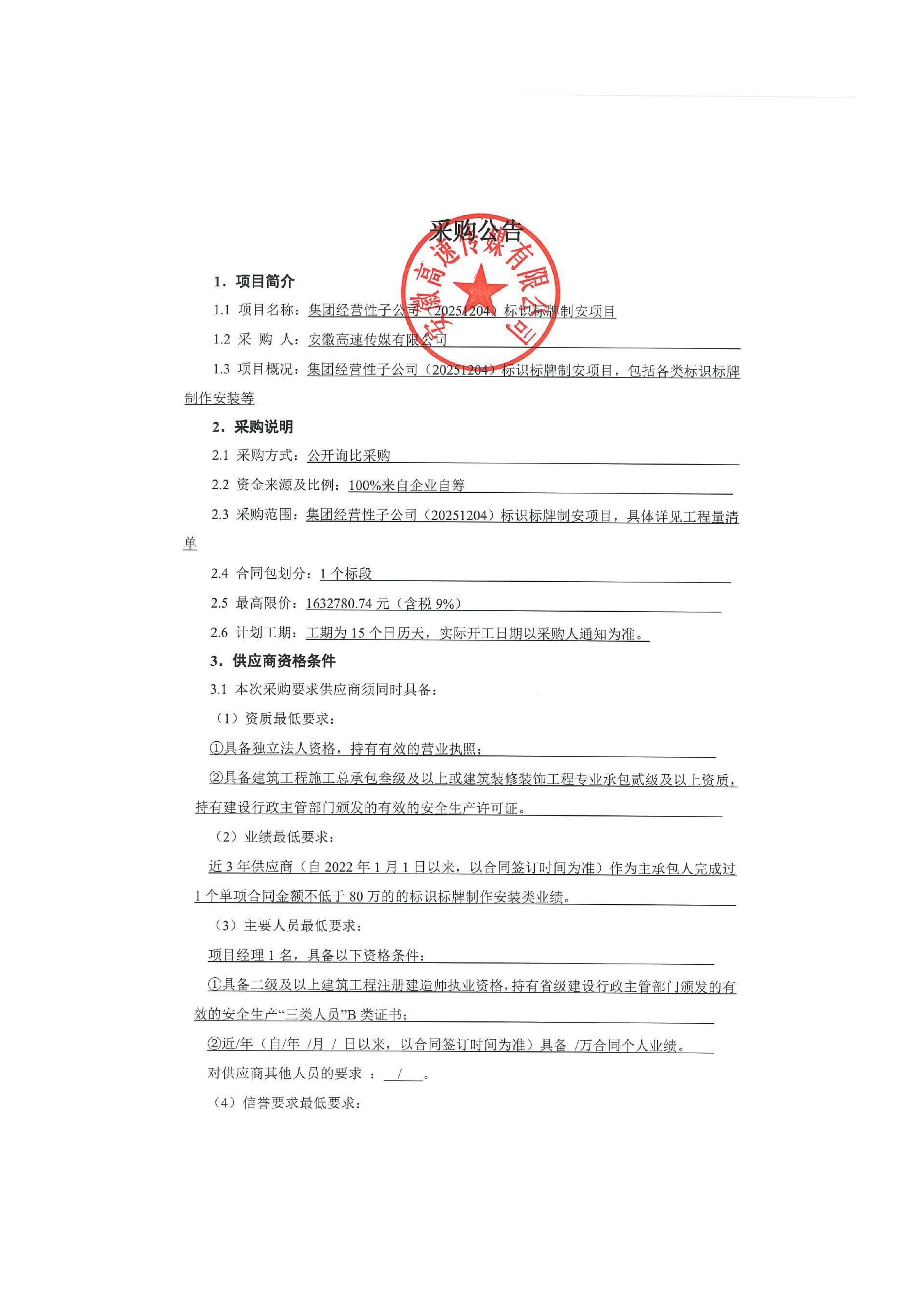 集团经营性子公司(20251204)标识标牌制安项目采购公告