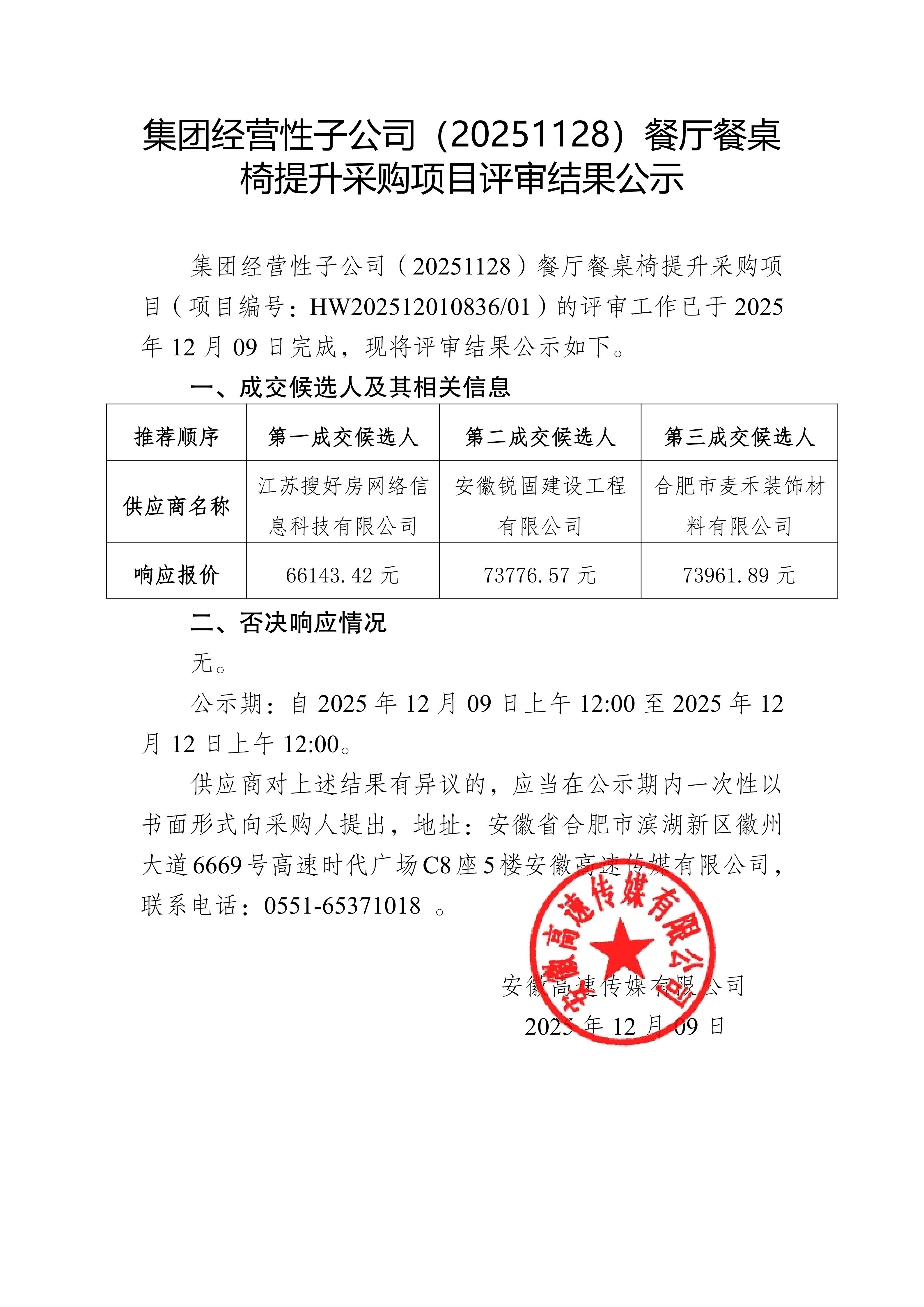 集团经营性子公司(20251128)餐厅餐桌 椅提升采购项目评审结果公示