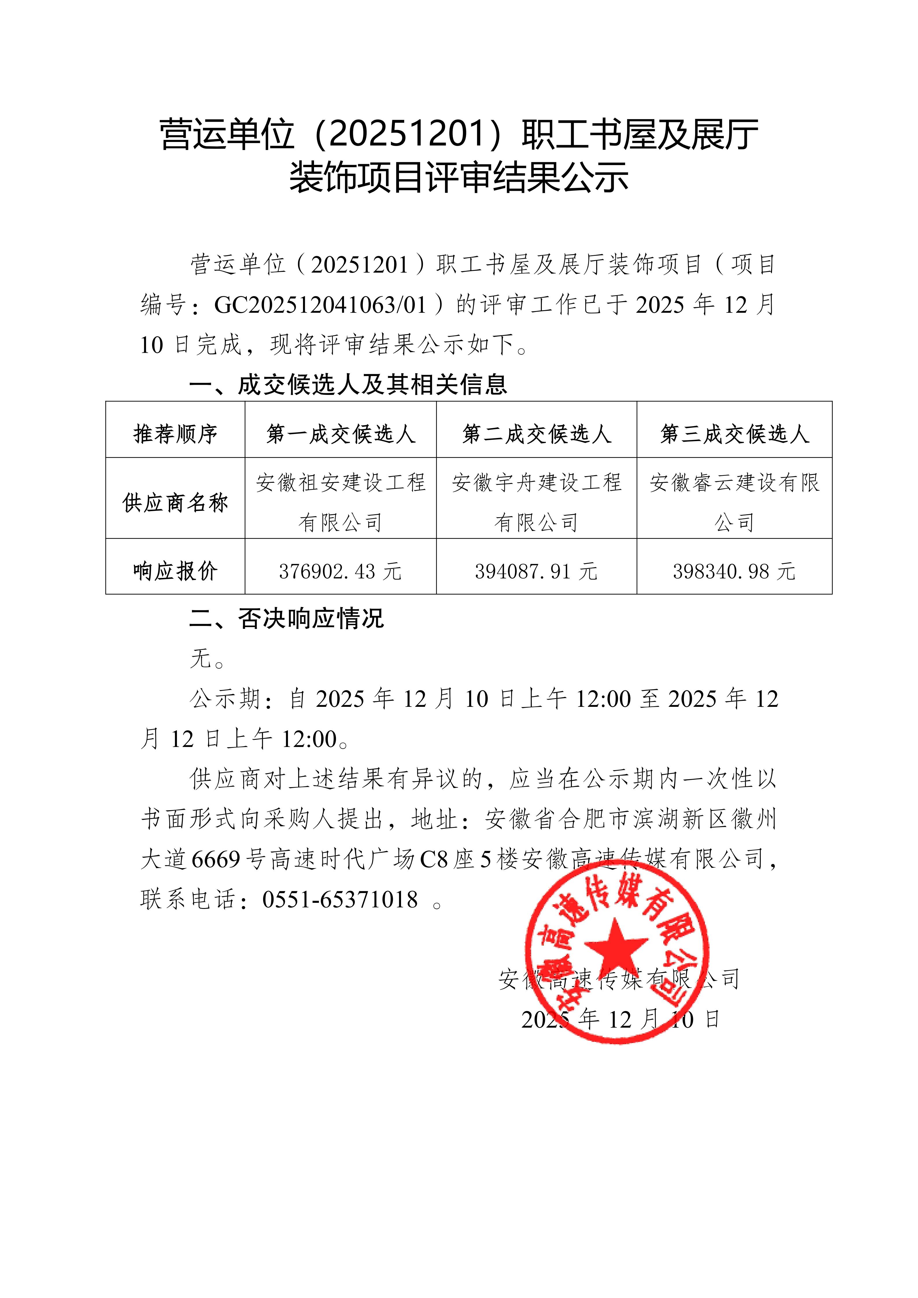 营运单位(20251201)职工书屋及展厅 装饰项目评审结果公示