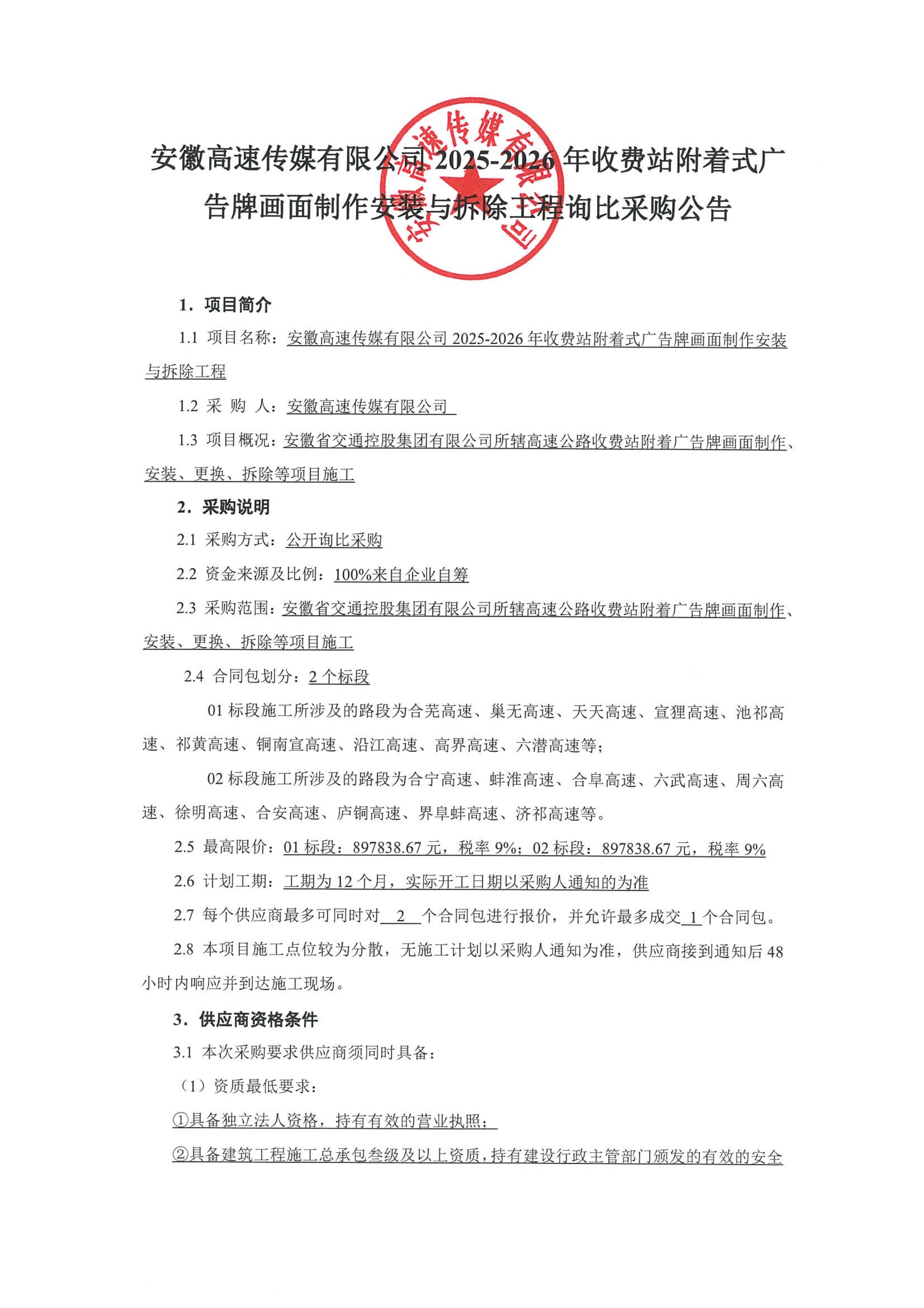 安徽省交通控股集团有限公司所辖高速公路收费站附着广告牌画面制作安装、更换、拆除等项目施工采购公告