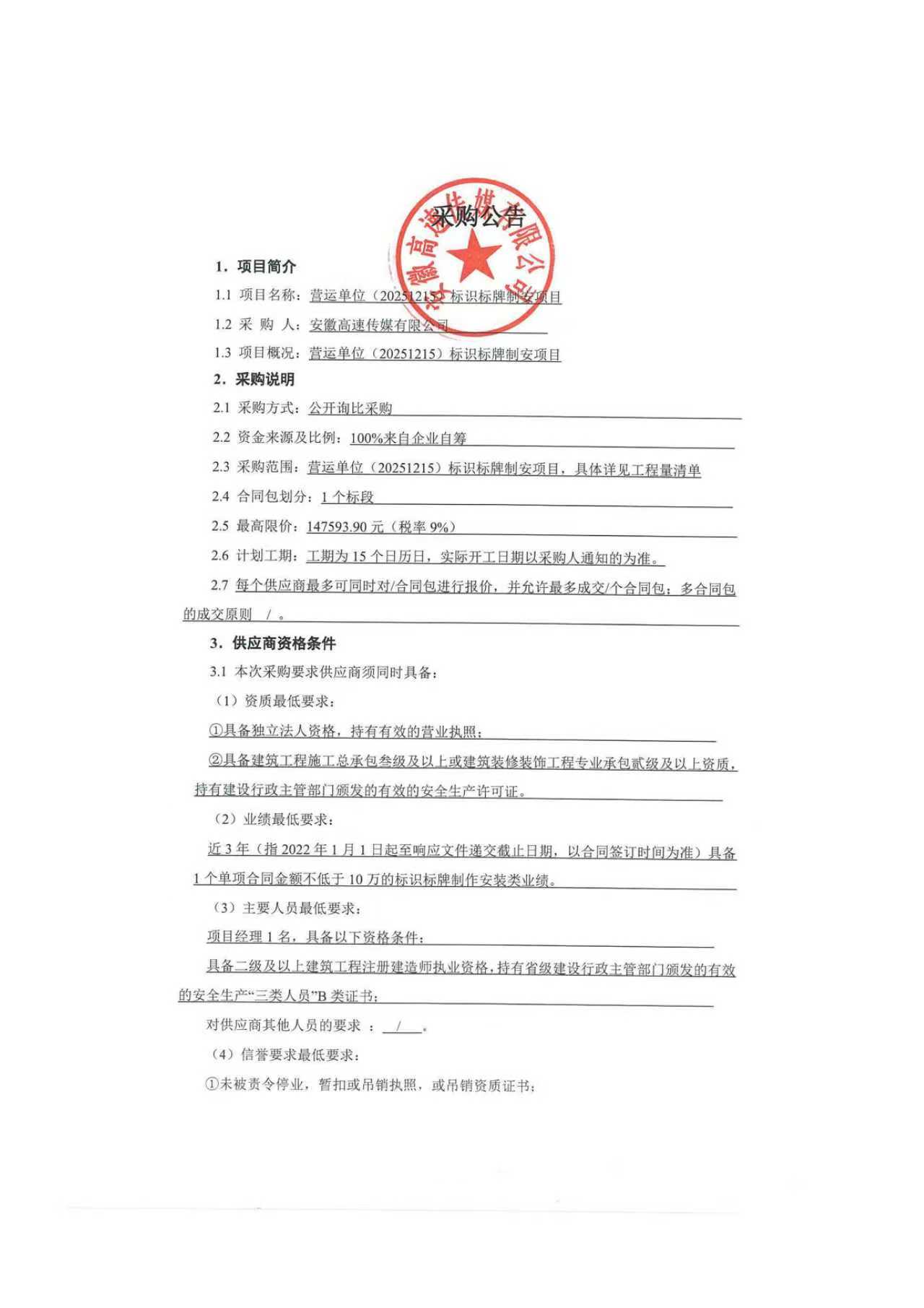 营运单位(20251215)标识标牌制安项目采购公告