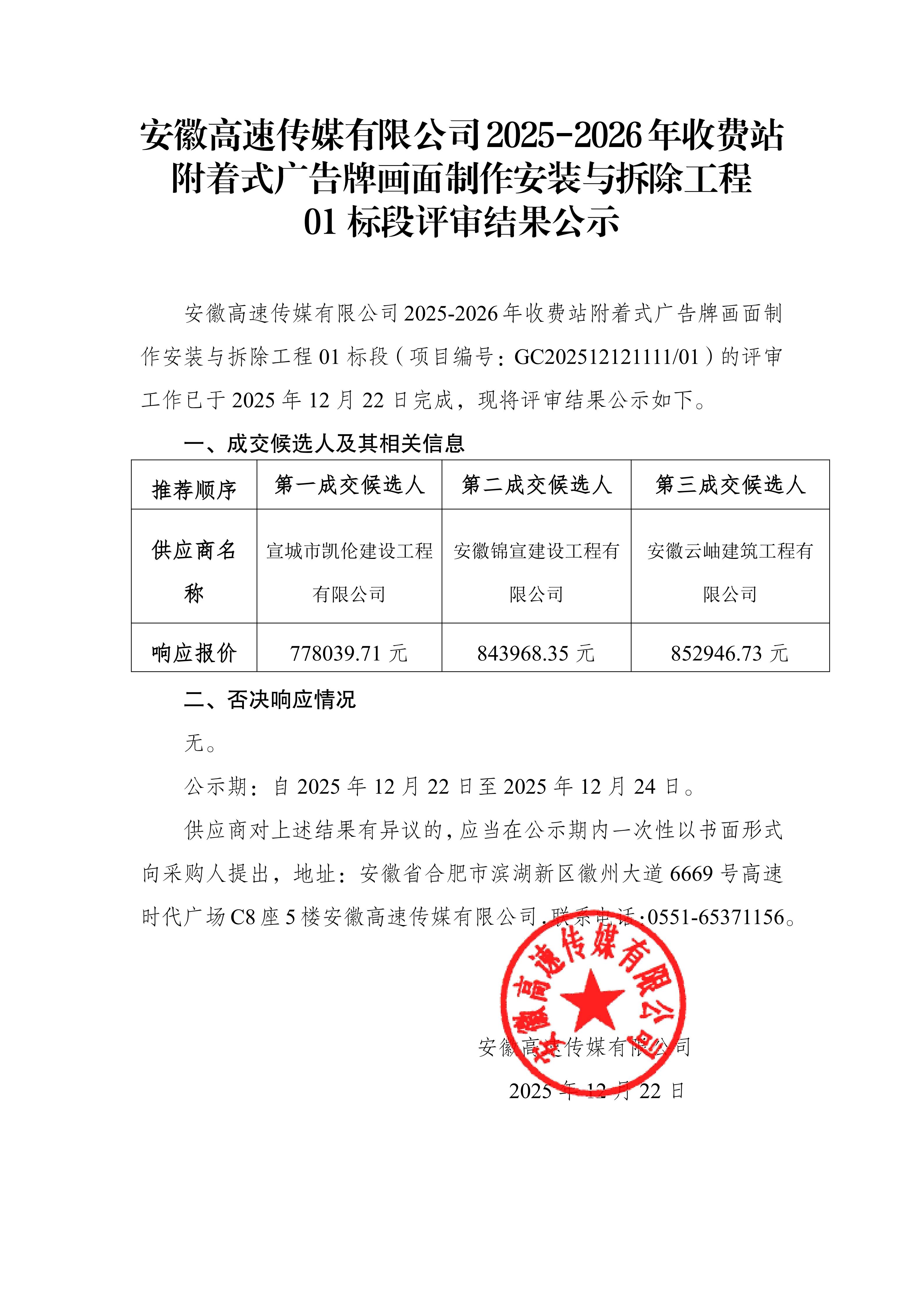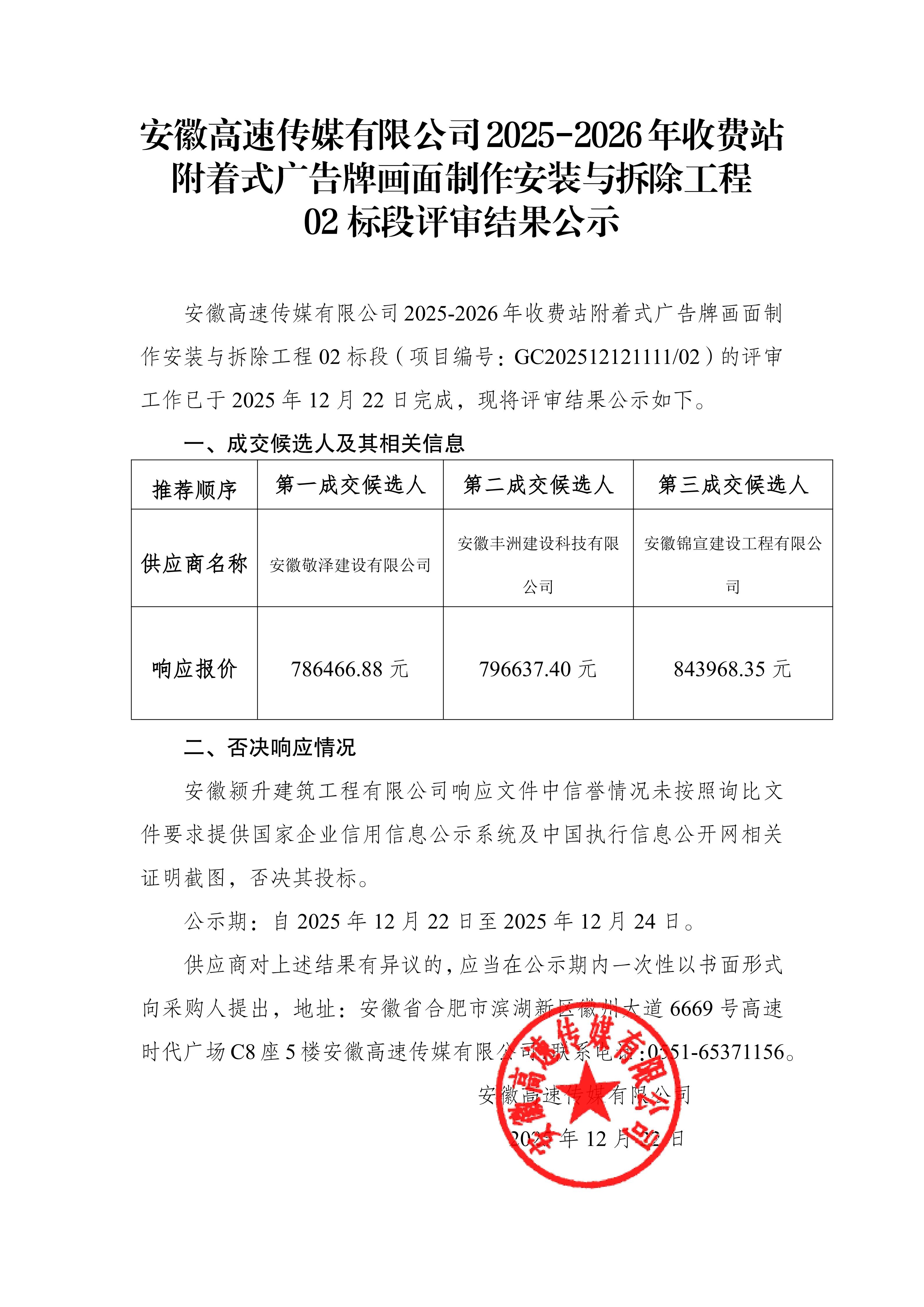 安徽高速传媒有限公司2025-2026年收费站 附着式广告牌画面制作安装与拆除工程评审结果公示