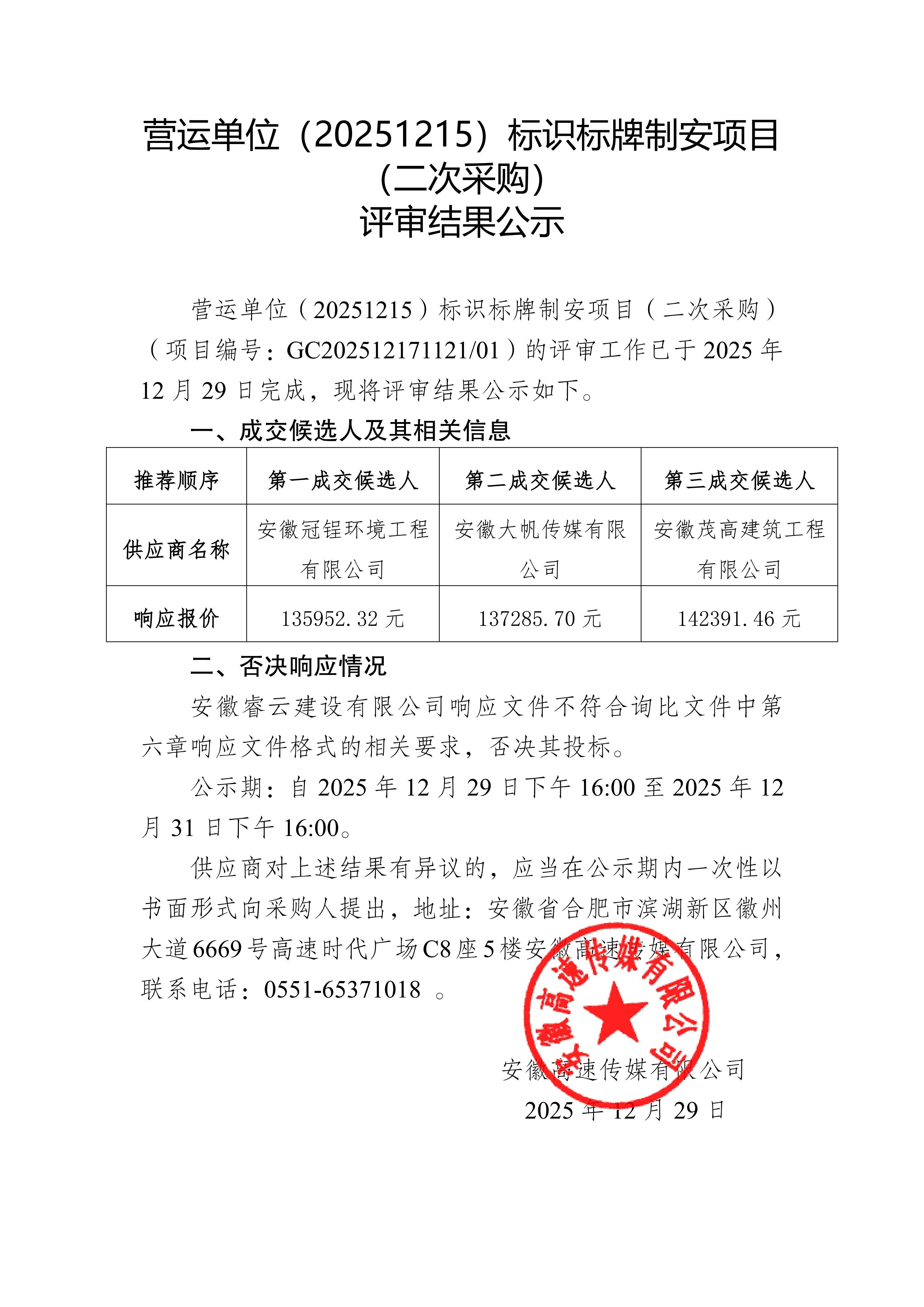 营运单位(20251215)标识标牌制安项目 (二次采购)评审结果公示