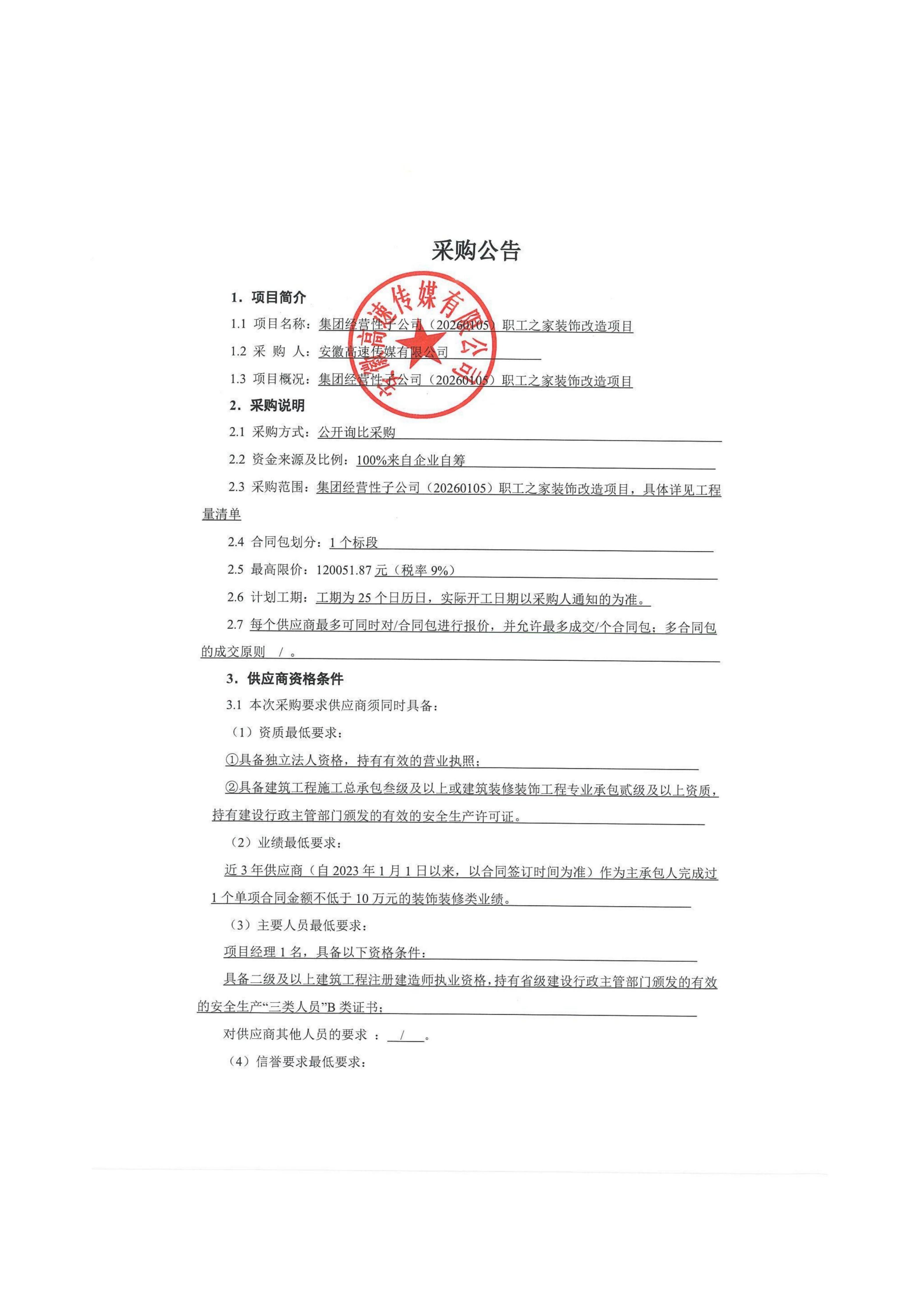集团经营性子公司(20260105)职工之家装饰改造项目采购公告