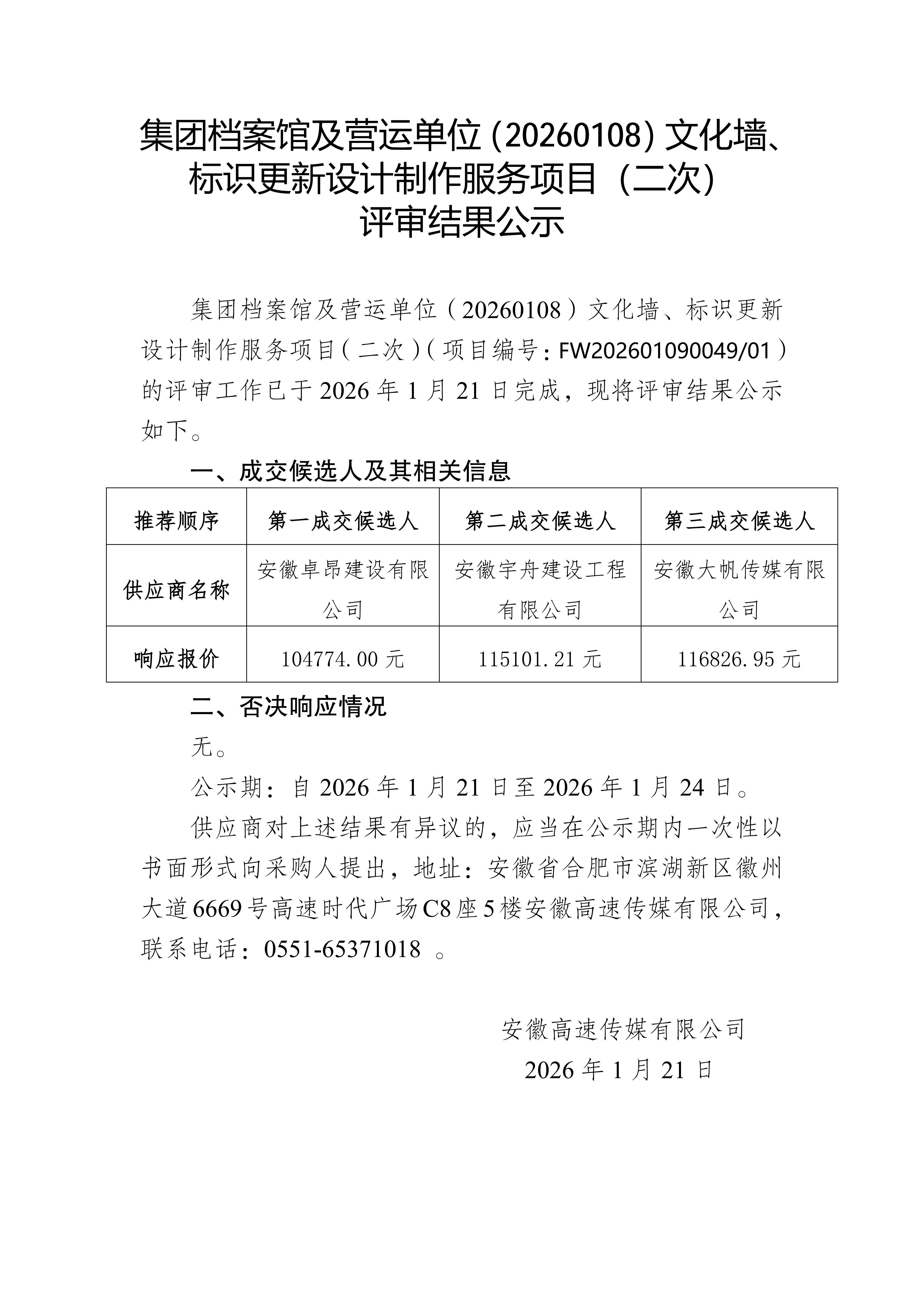 集团档案馆及营运单位(20260108)文化墙、标识更新设计制作服务项目(二次)评审结果公示