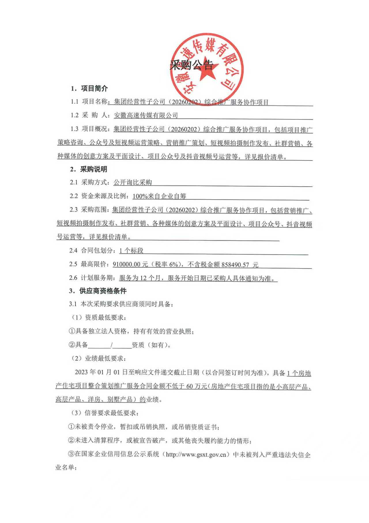集团经营性子公司(20260202)综合推广服务协作项目采购公告