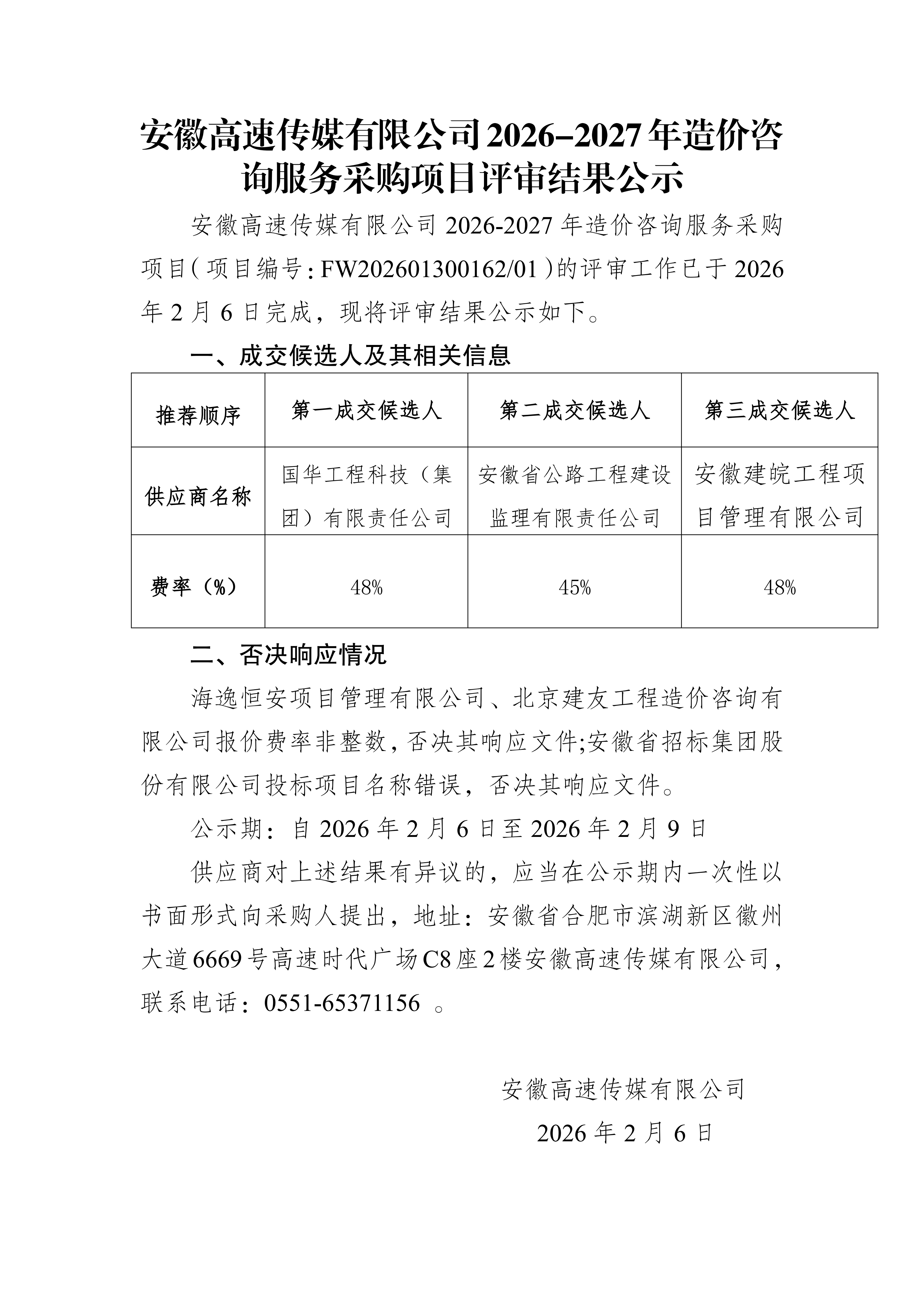 安徽高速传媒有限公司2026-2027年造价咨询服务采购项目评审结果公示