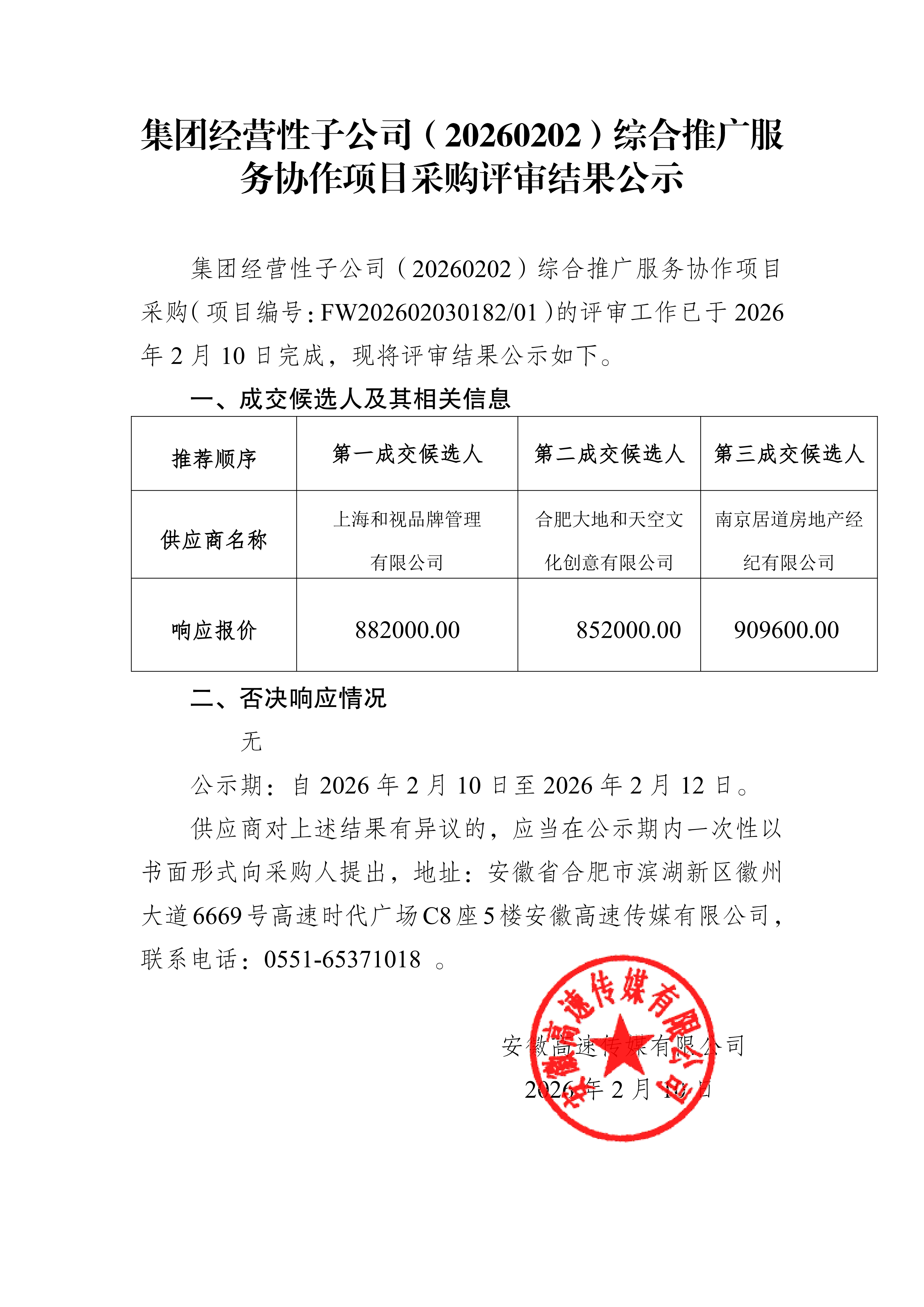 集团经营性子公司(20260202)综合推广服 务协作项目采购评审结果公示