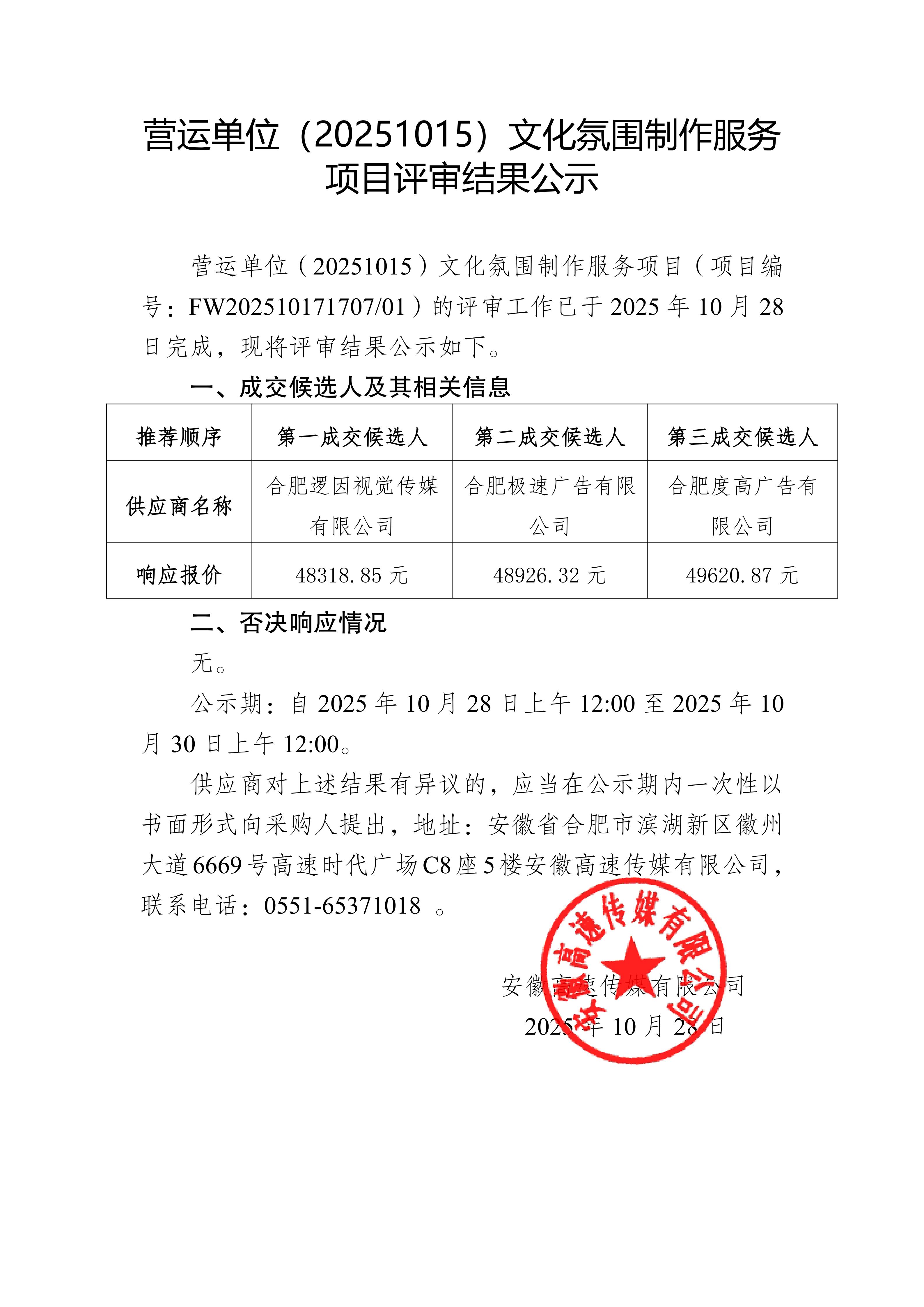 营运单位(20251015)文化氛围制作服务 项目评审结果公示