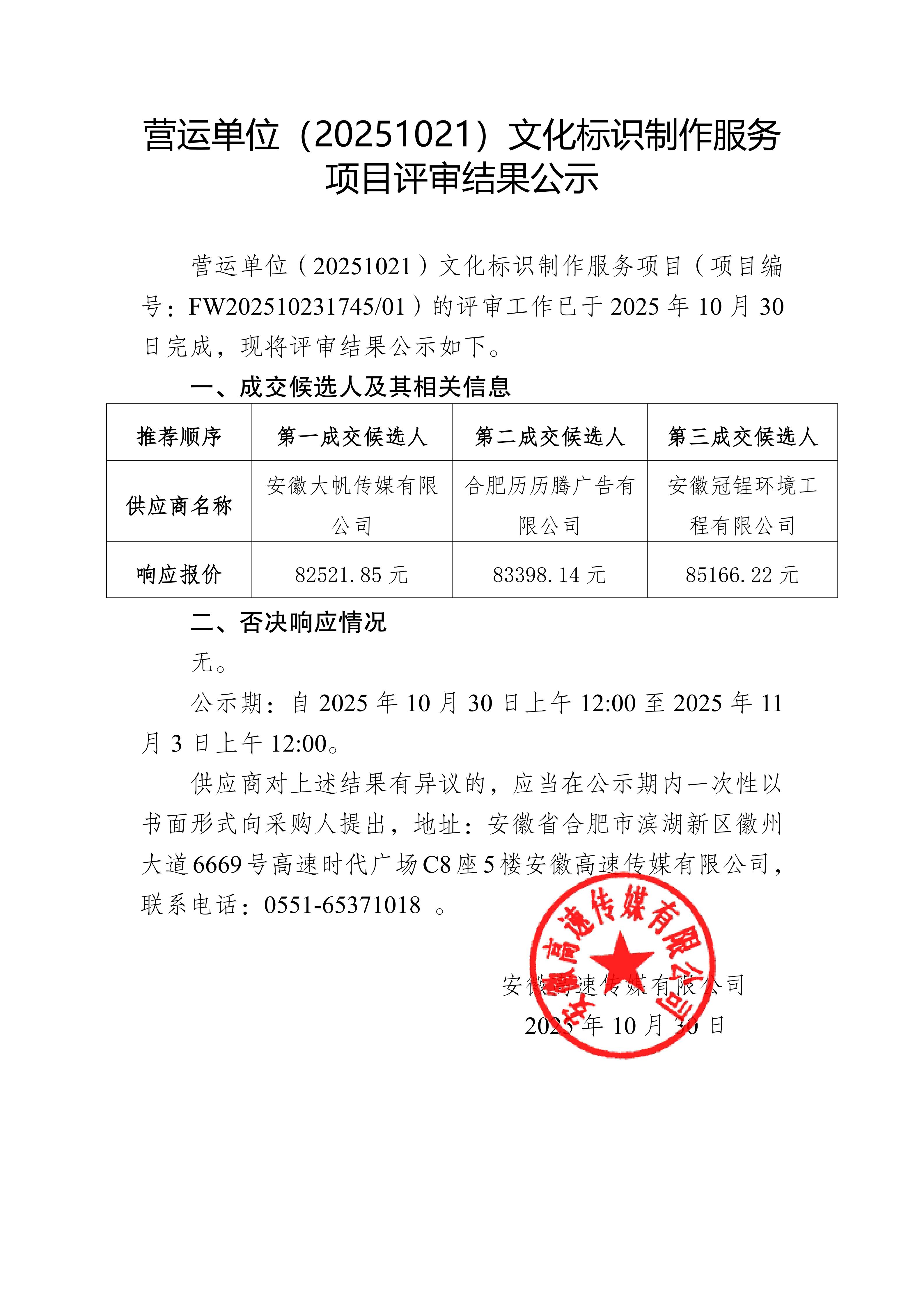 营运单位(20251021)文化标识制作服务 项目评审结果公示