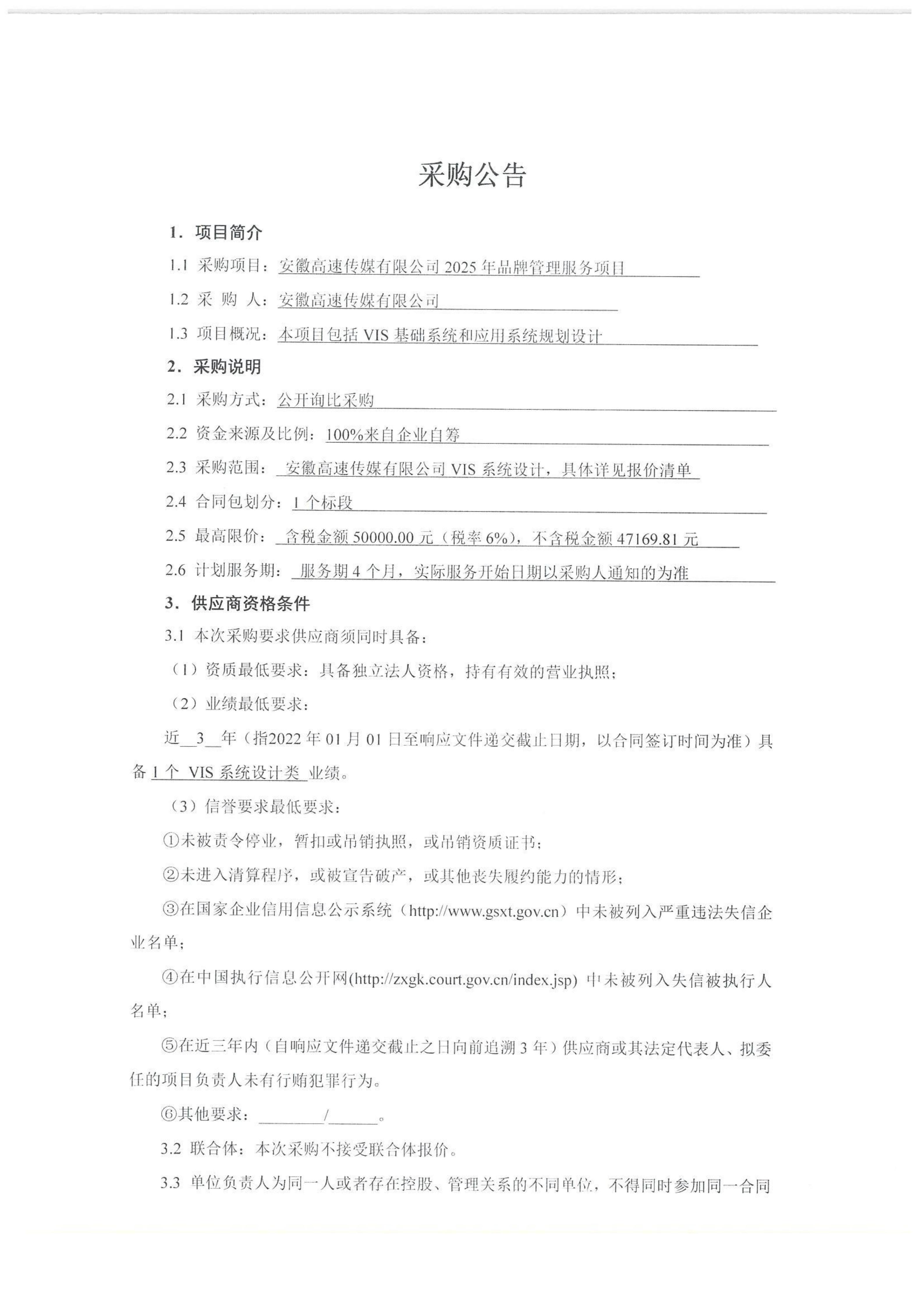 安徽高速传媒有限公司2025年品牌管理服务项目采购公告