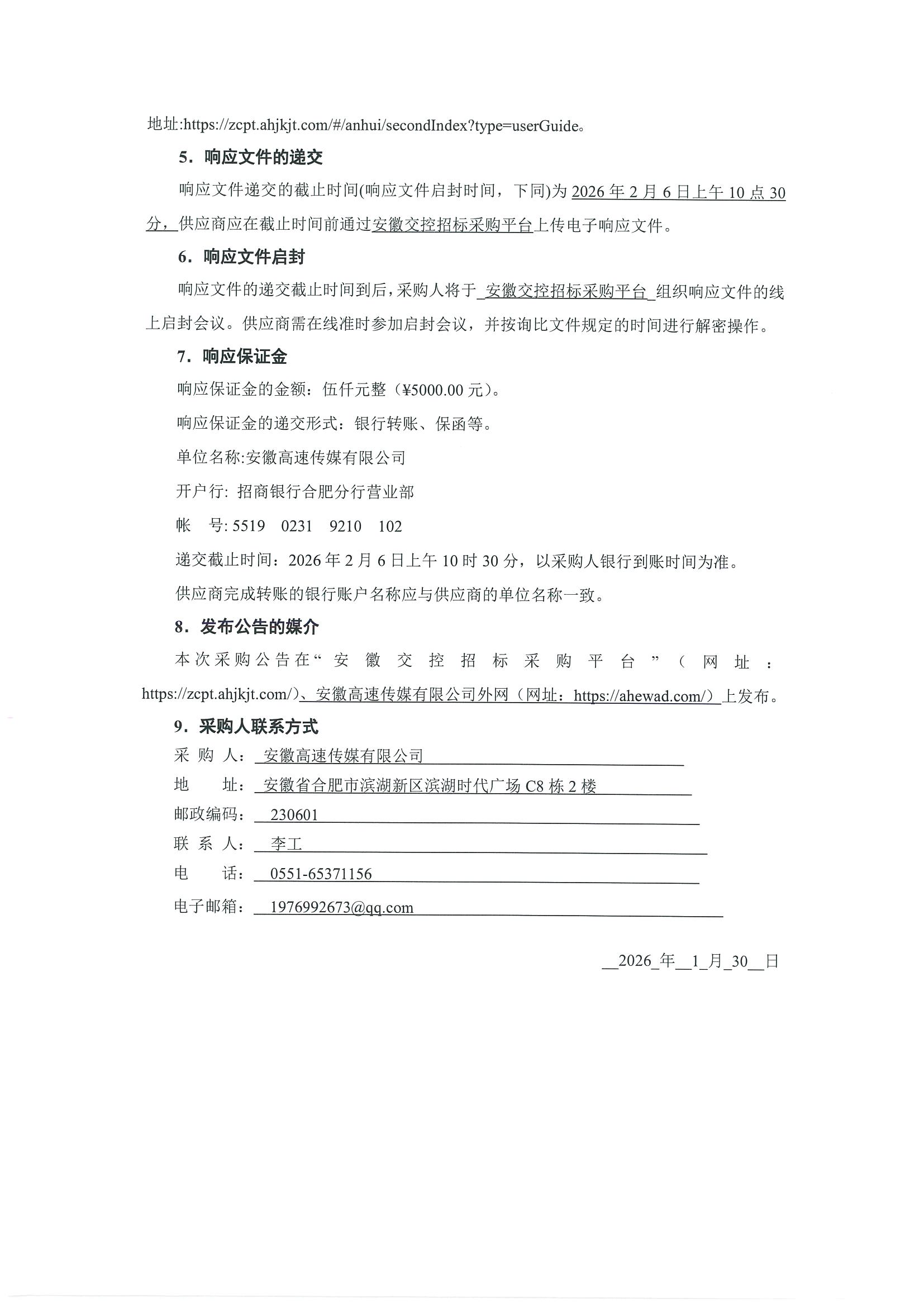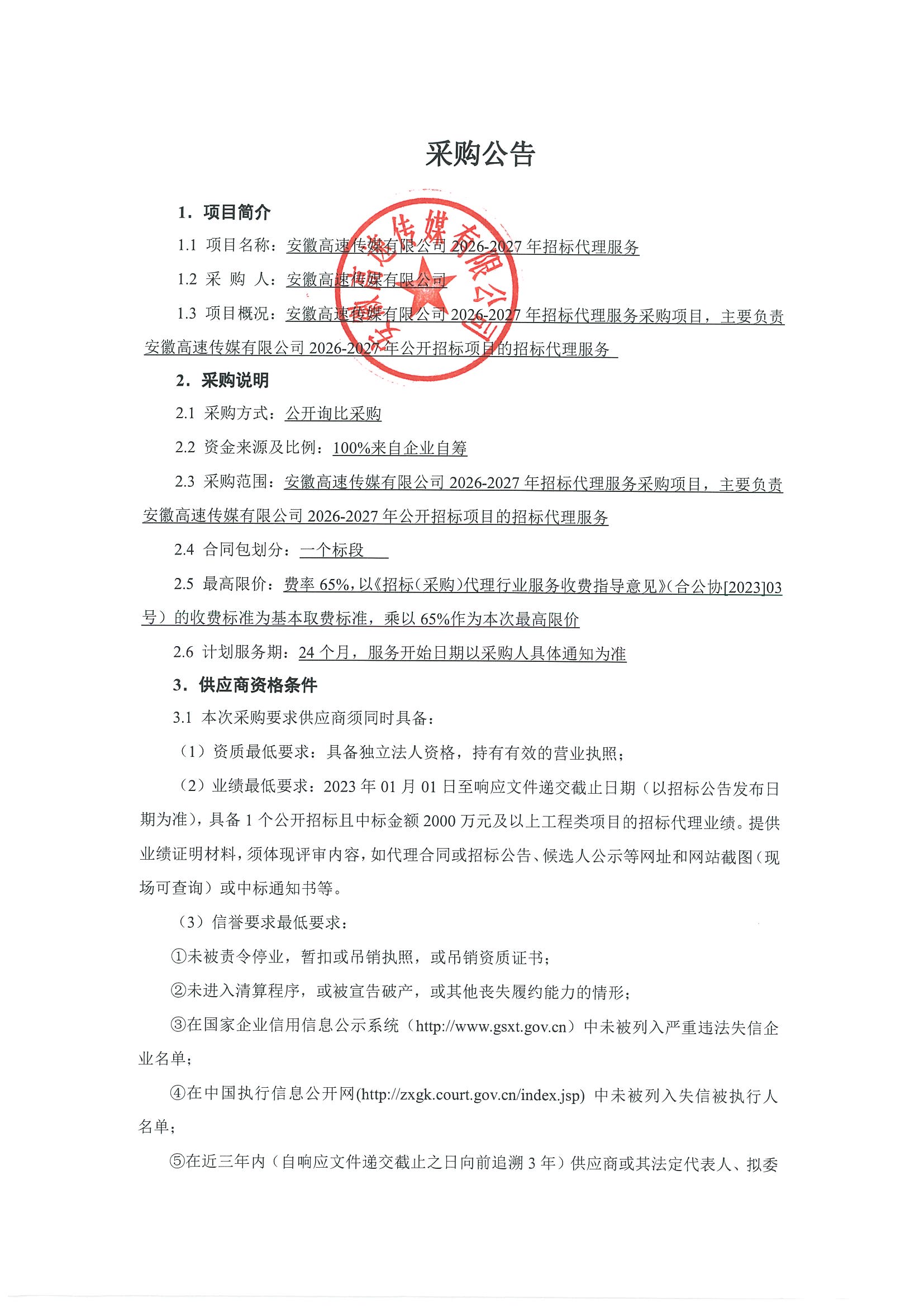 安徽高速传媒有限公司2026-2027年招标代理服务