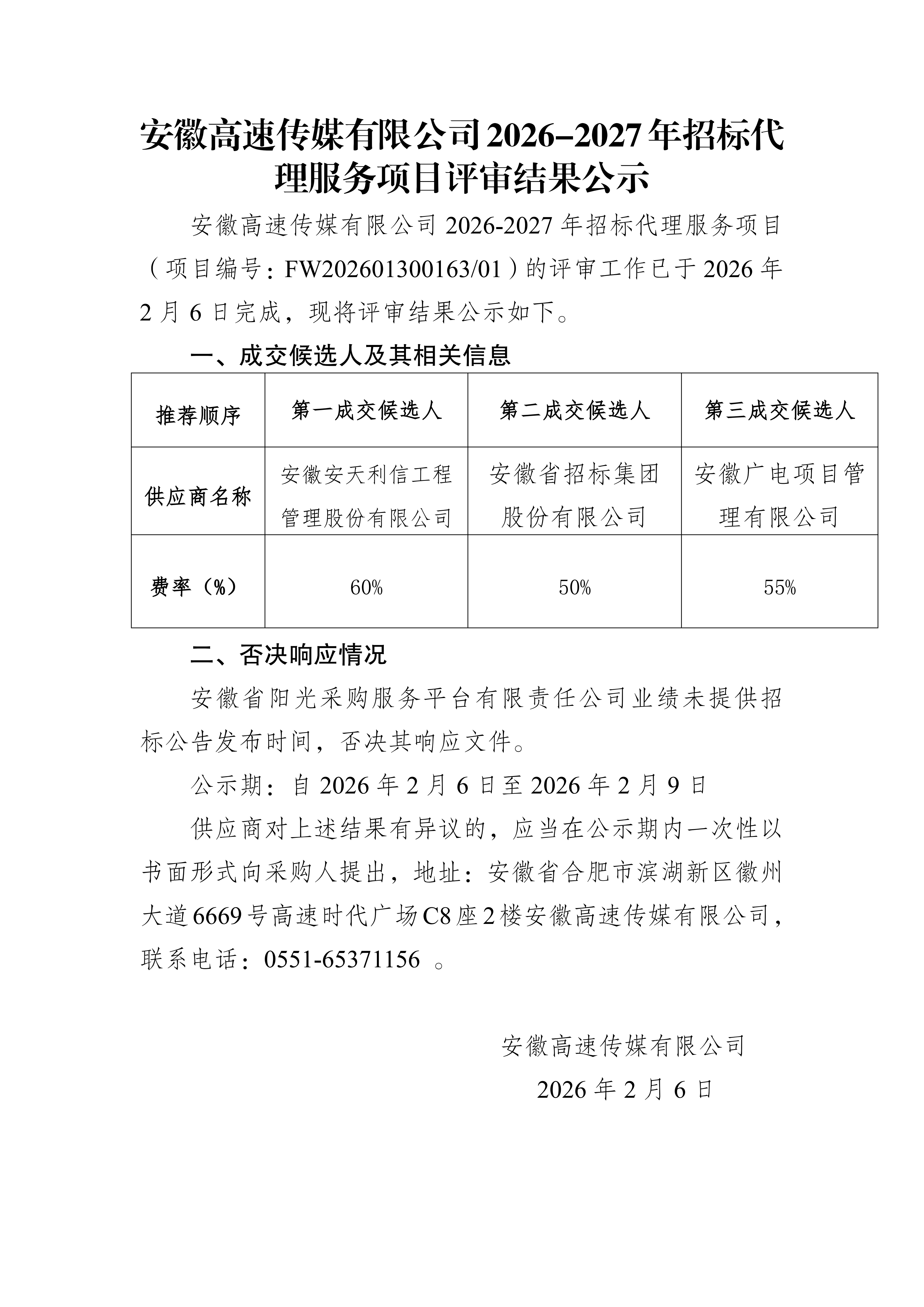 安徽高速传媒有限公司2026-2027年招标代 理服务项目评审结果公示