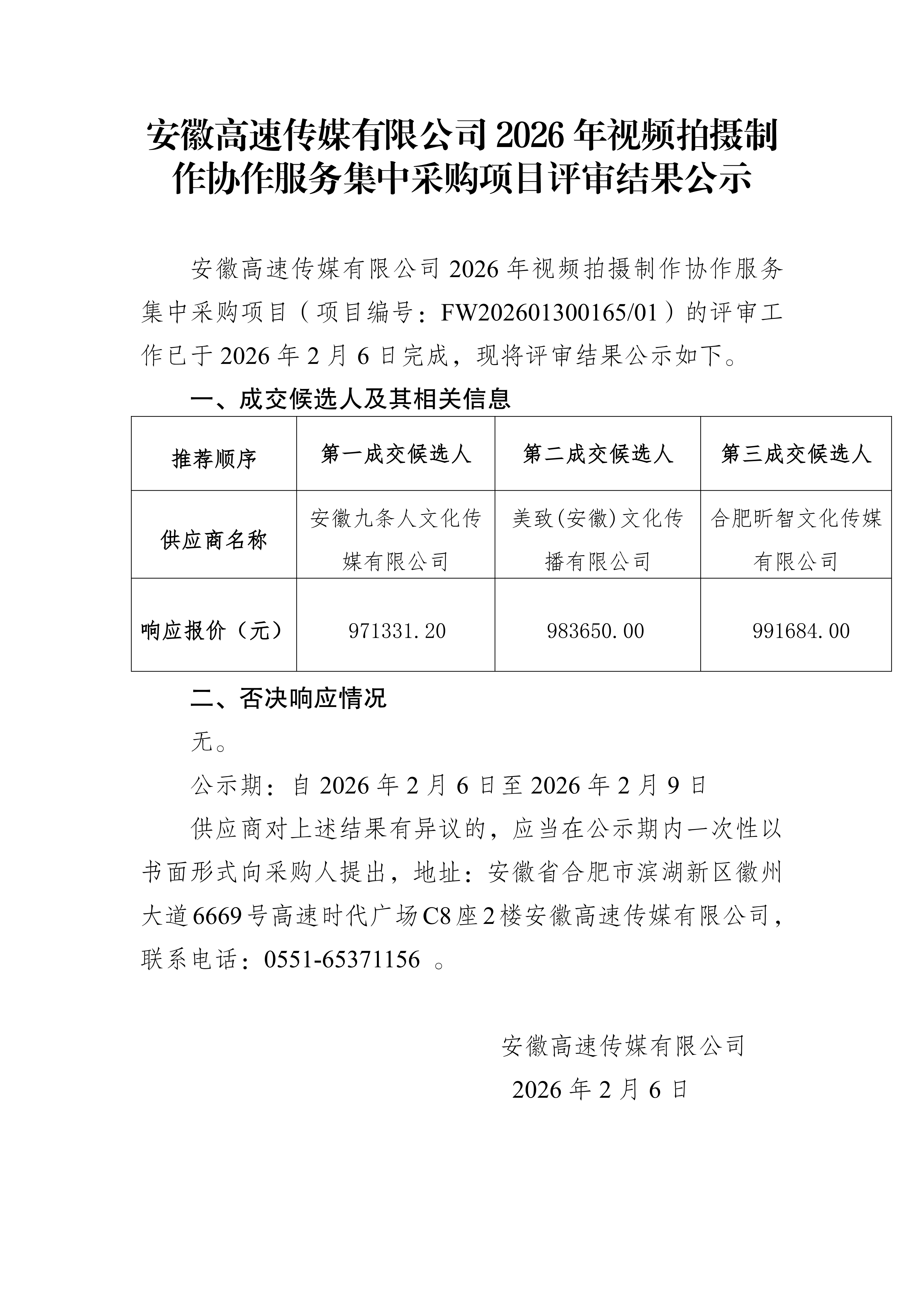 安徽高速传媒有限公司2026年视频拍摄制作协作服务集中采购项目评审结果公示